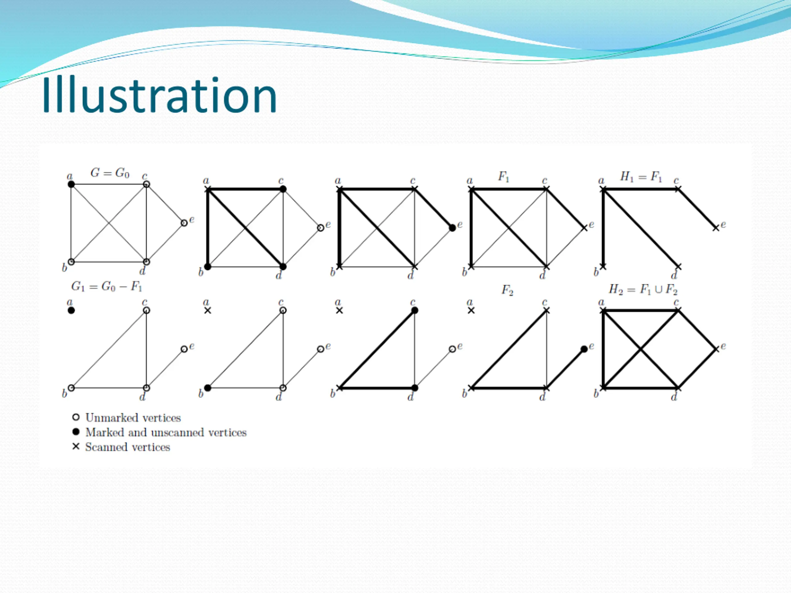SFS Algorithm do { Choose lowest preorder numbered vertex that is marked. Scan that vertex. Add all edges of neighbors incident to scanned vertex to Ei that they have their other end marked and mark all those neighbouring vertices. } until (no more edges can be added)