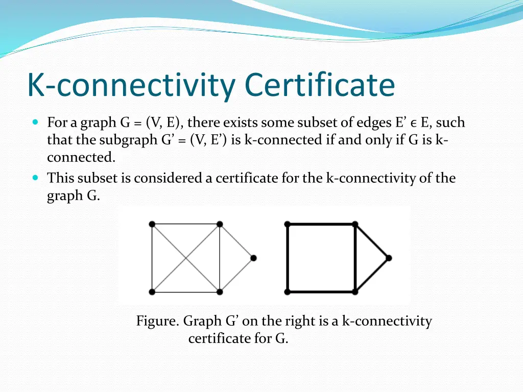 K-connectivity Certificate For a graph G = (V, E), there exists some subset of edges E E, such that the subgraph G = (V, E ) is k-connected if and only if G is k- connected. This subset is considered a certificate for the k-connectivity of the graph G. Figure. Graph G on the right is a k-connectivity certificate for G.