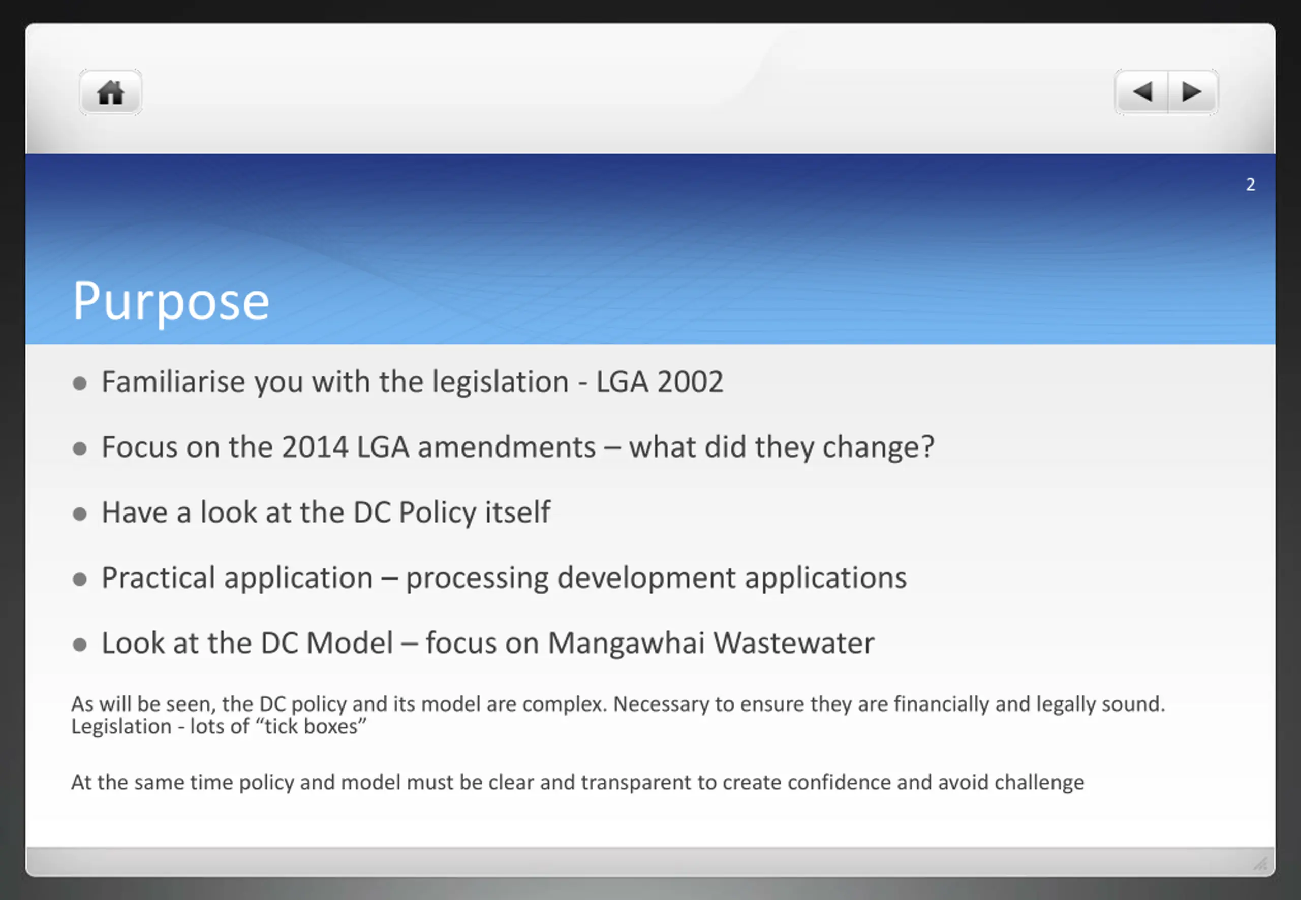 HomeButton.png 2 Purpose Familiarise you with the legislation - LGA 2002 Focus on the 2014 LGA amendments what did they change? Have a look at the DC Policy itself Practical application processing development applications Look at the DC Model focus on Mangawhai Wastewater As will be seen, the DC policy and its model are complex. Necessary to ensure they are financially and legally sound. Legislation - lots of tick boxes At the same time policy and model must be clear and transparent to create confidence and avoid challenge