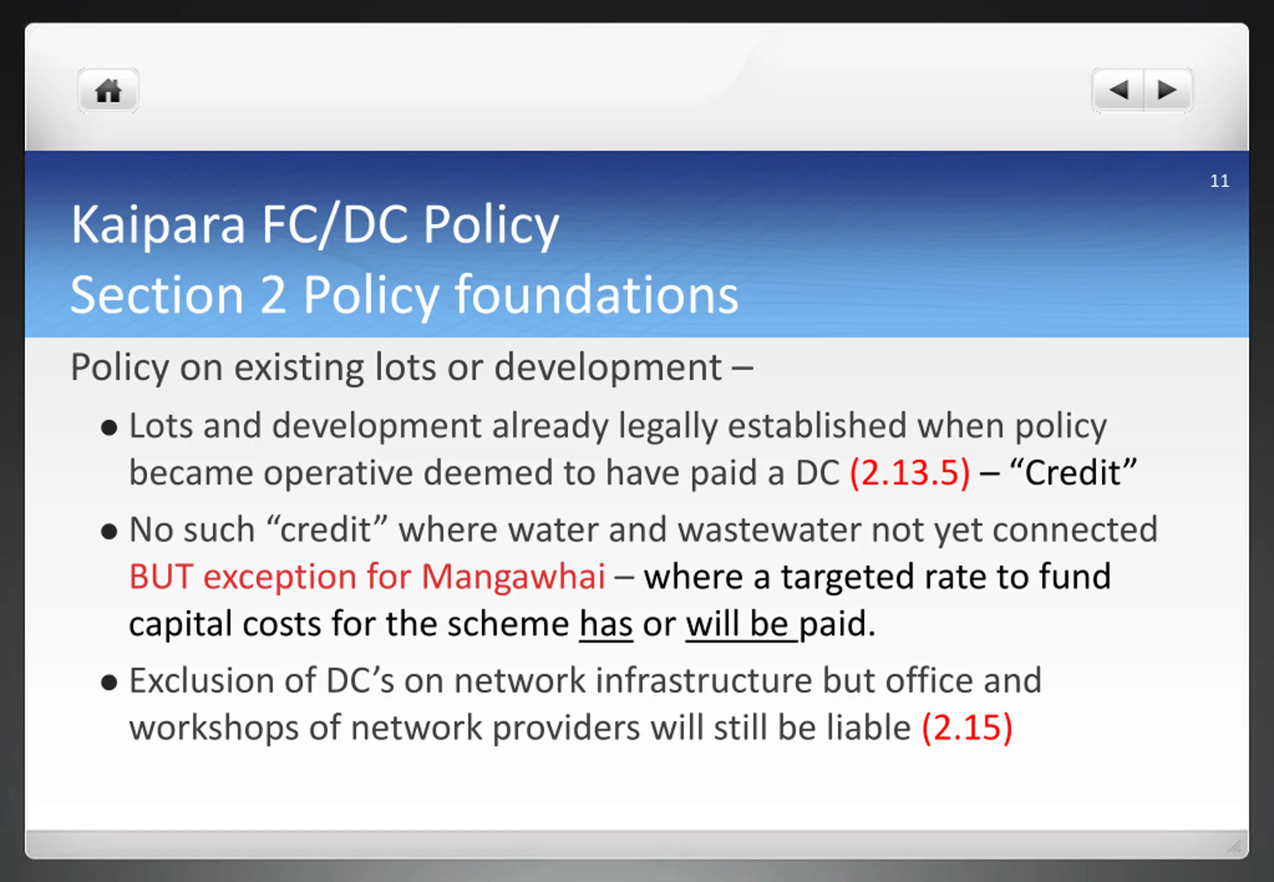 HomeButton.png 11 Kaipara FC/DC Policy Section 2 Policy foundations Policy on existing lots or development Lots and development already legally established when policy became operative deemed to have paid a DC (2.13.5) Credit No such credit where water and wastewater not yet connected BUT exception for Mangawhai where a targeted rate to fund capital costs for the scheme has or will be paid. Exclusion of DC s on network infrastructure but office and workshops of network providers will still be liable (2.15)
