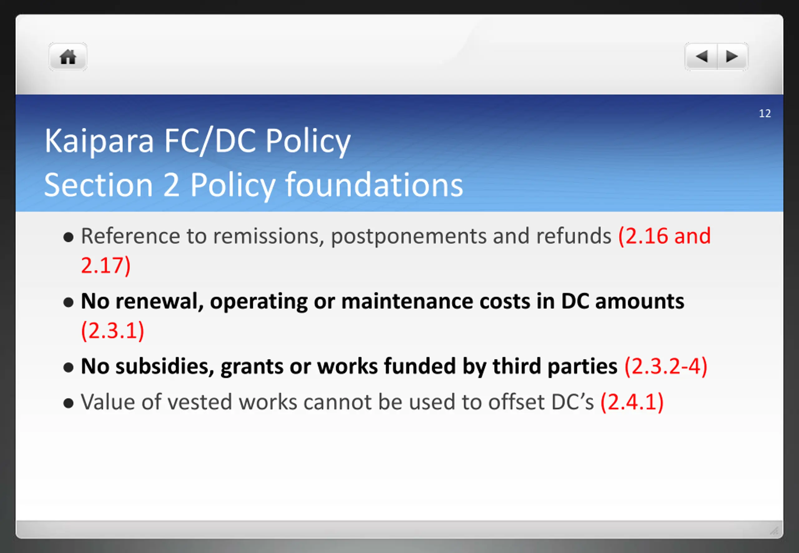 HomeButton.png 12 Kaipara FC/DC Policy Section 2 Policy foundations Reference to remissions, postponements and refunds (2.16 and 2.17) No renewal, operating or maintenance costs in DC amounts (2.3.1) No subsidies, grants or works funded by third parties (2.3.2-4) Value of vested works cannot be used to offset DC s (2.4.1)