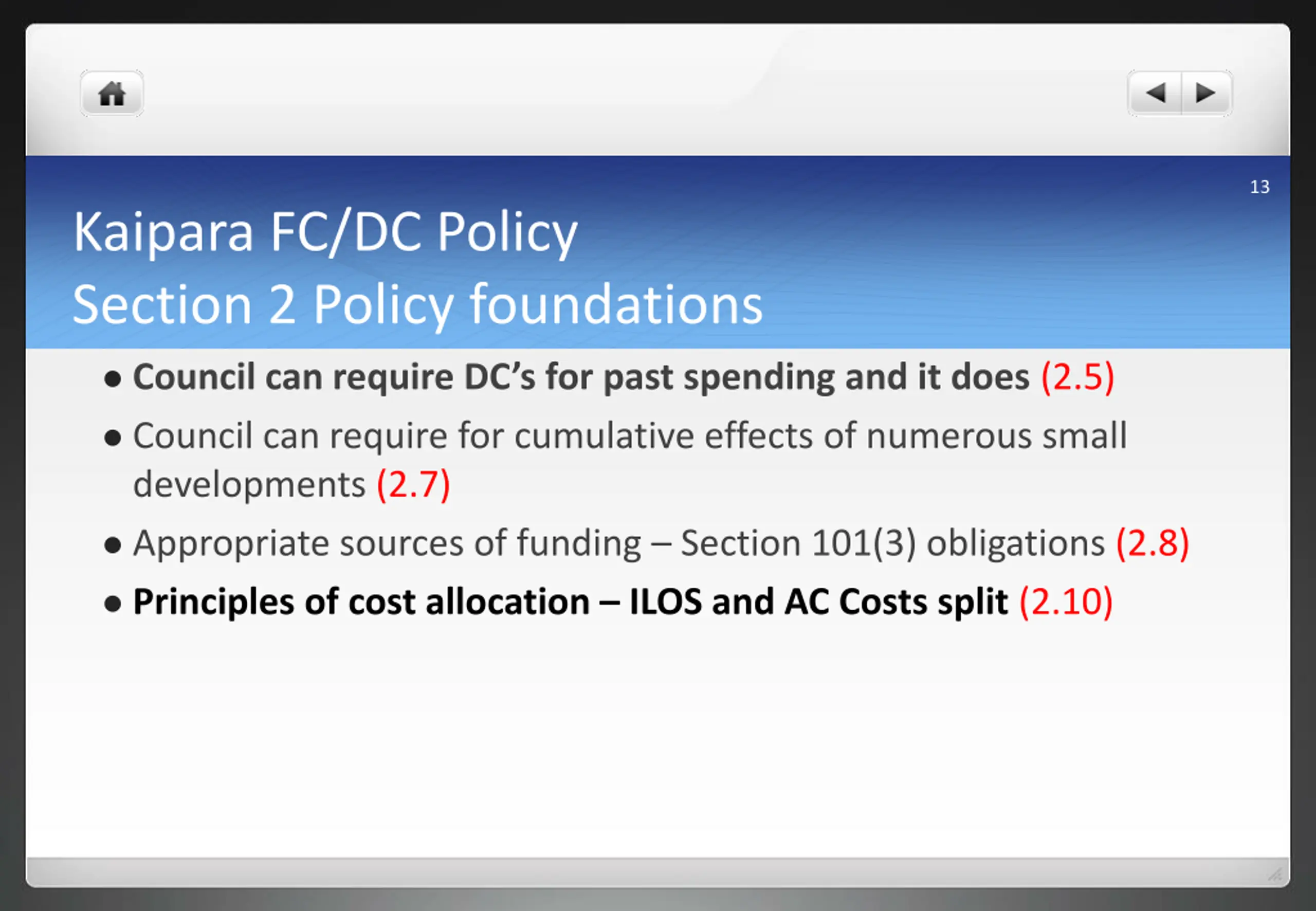 HomeButton.png 13 Kaipara FC/DC Policy Section 2 Policy foundations Council can require DC s for past spending and it does (2.5) Council can require for cumulative effects of numerous small developments (2.7) Appropriate sources of funding Section 101(3) obligations (2.8) Principles of cost allocation ILOS and AC Costs split (2.10)