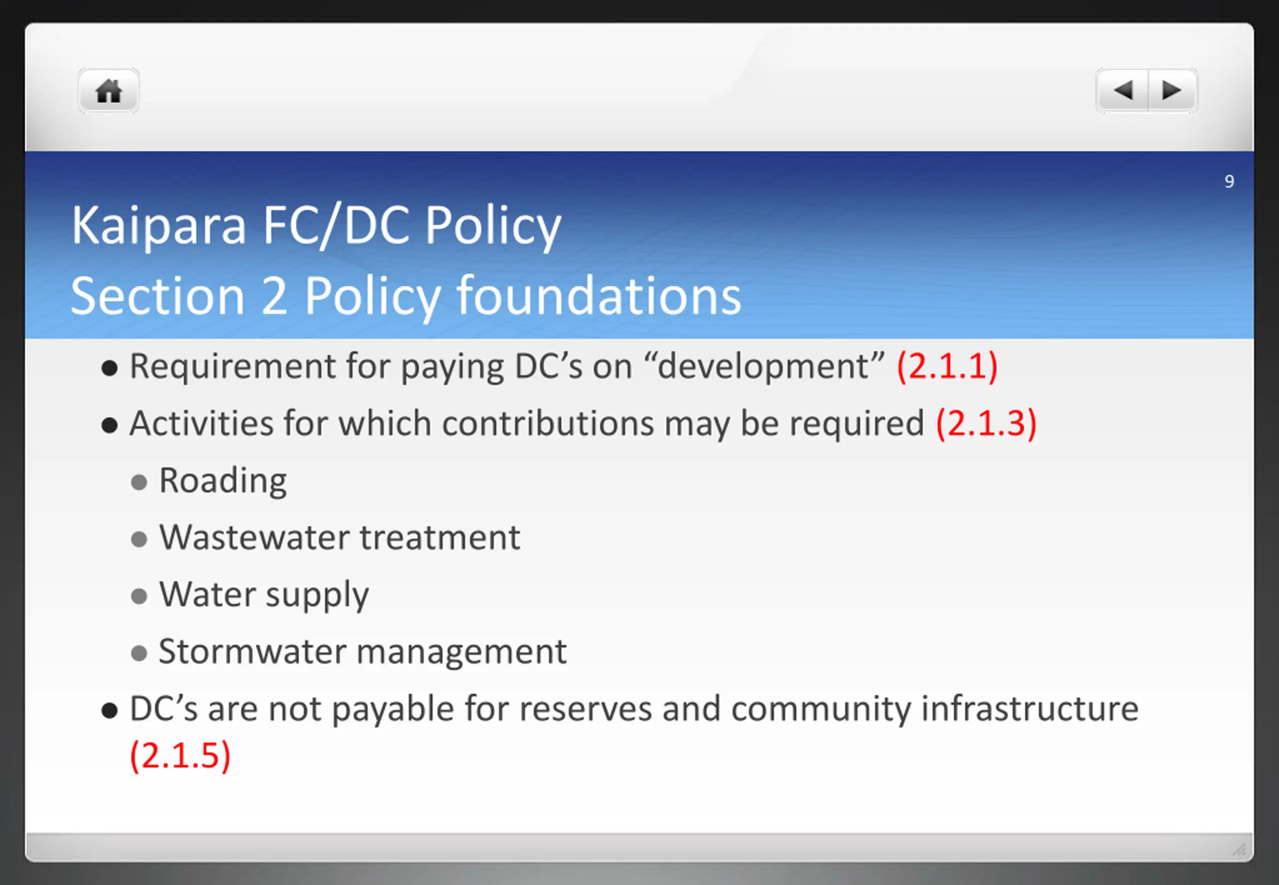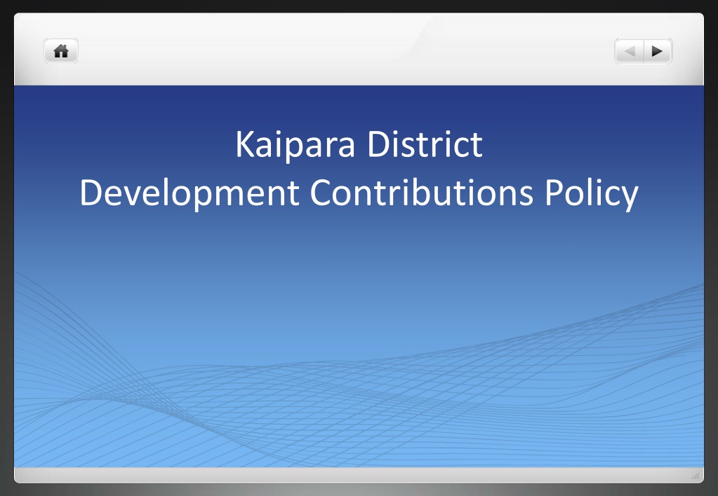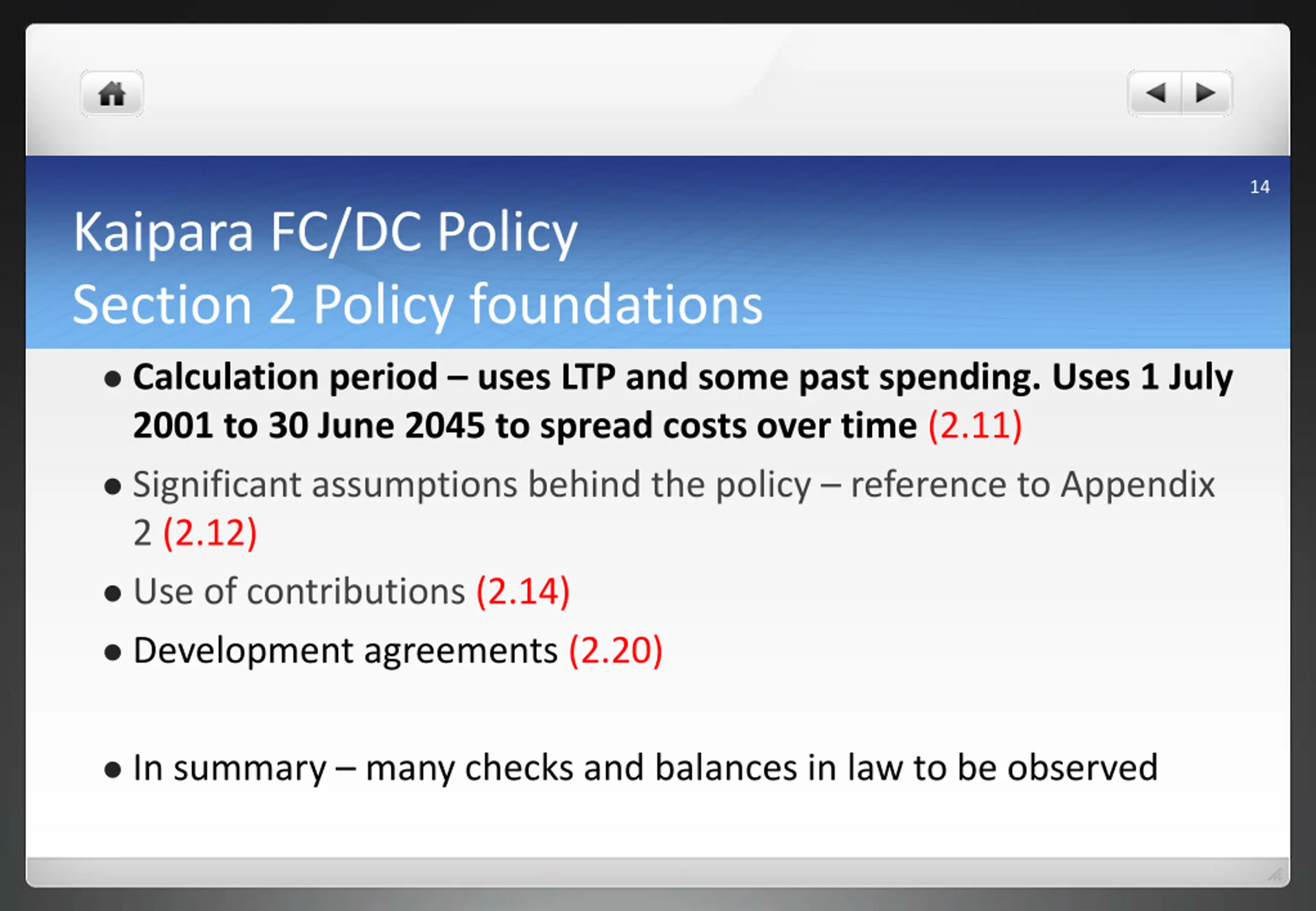 HomeButton.png 14 Kaipara FC/DC Policy Section 2 Policy foundations Calculation period uses LTP and some past spending. Uses 1 July 2001 to 30 June 2045 to spread costs over time (2.11) Significant assumptions behind the policy reference to Appendix 2 (2.12) Use of contributions (2.14) Development agreements (2.20) In summary many checks and balances in law to be observed