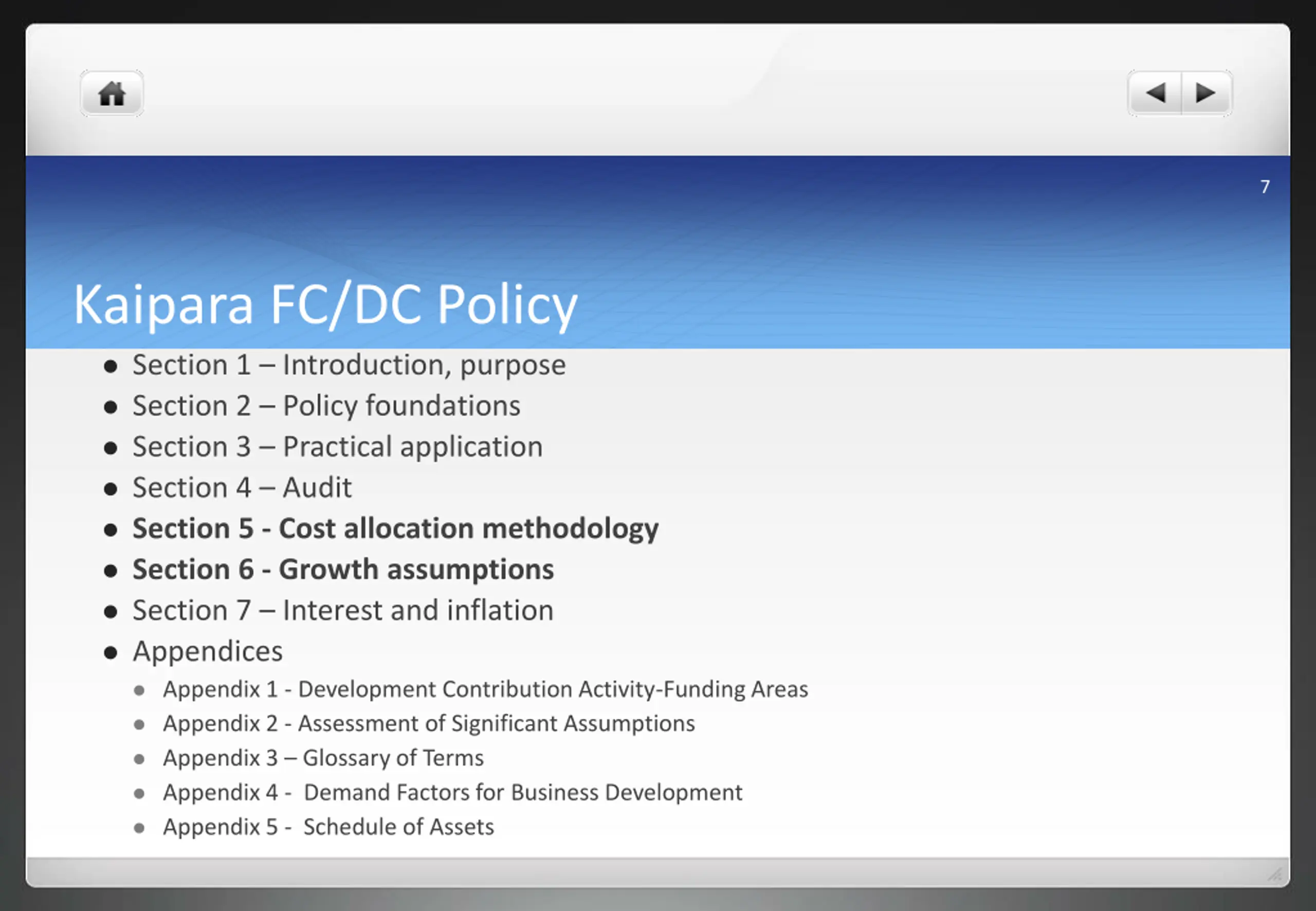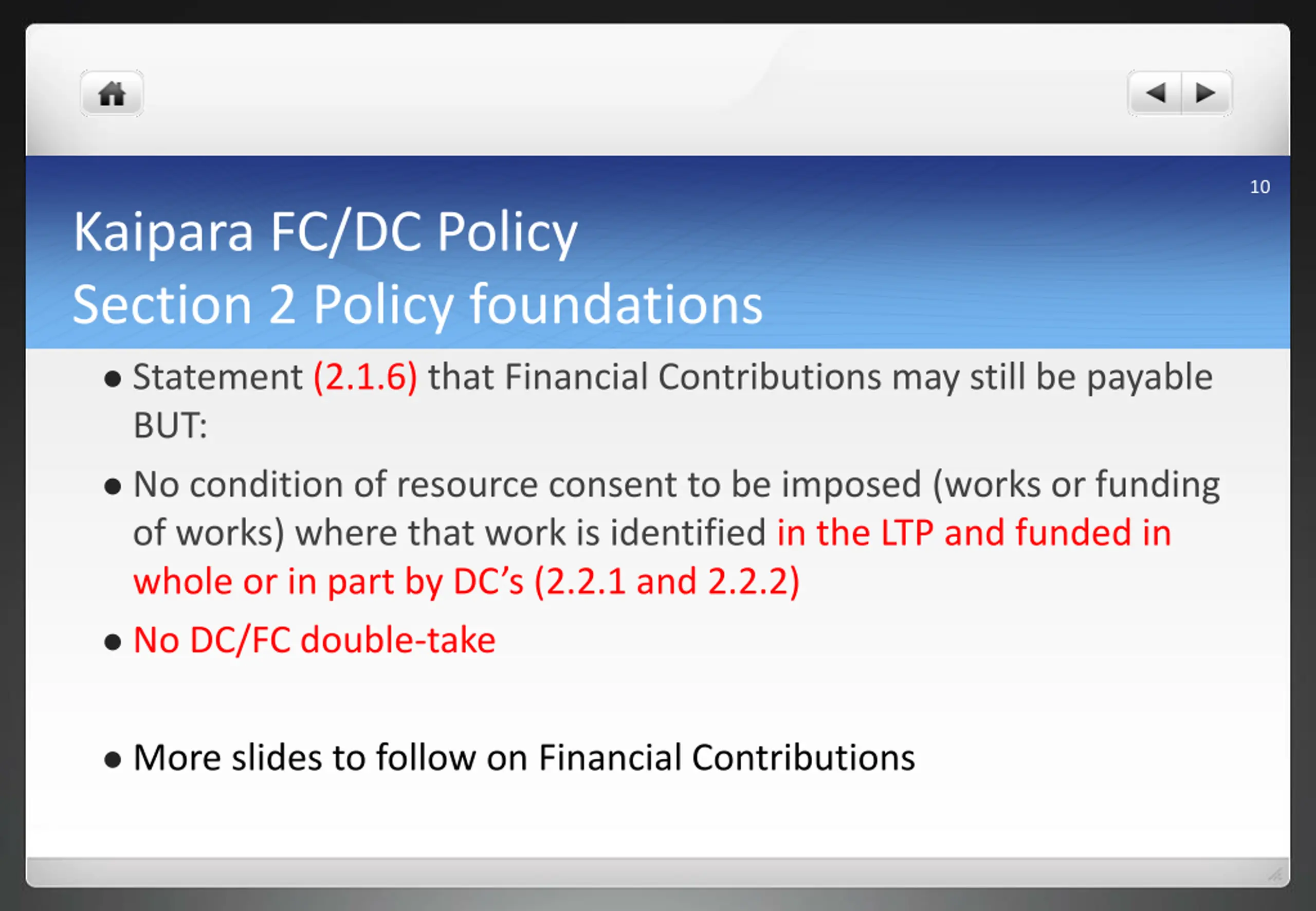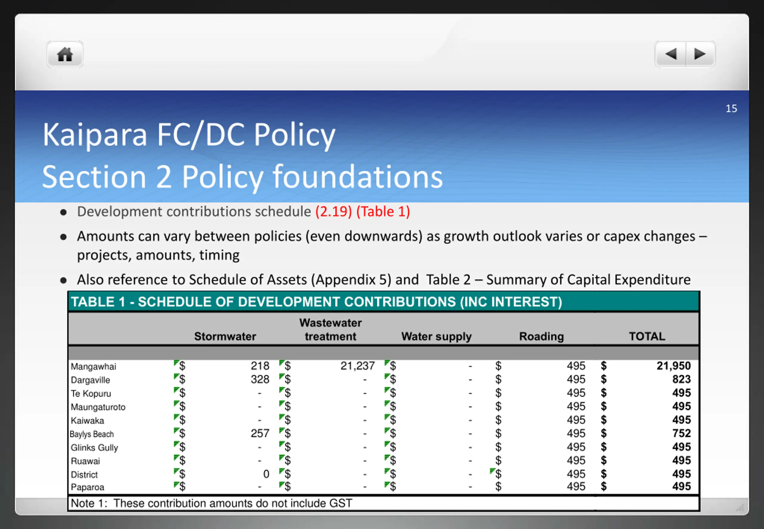 HomeButton.png 14 Kaipara FC/DC Policy Section 2 Policy foundations Calculation period uses LTP and some past spending. Uses 1 July 2001 to 30 June 2045 to spread costs over time (2.11) Significant assumptions behind the policy reference to Appendix 2 (2.12) Use of contributions (2.14) Development agreements (2.20) In summary many checks and balances in law to be observed