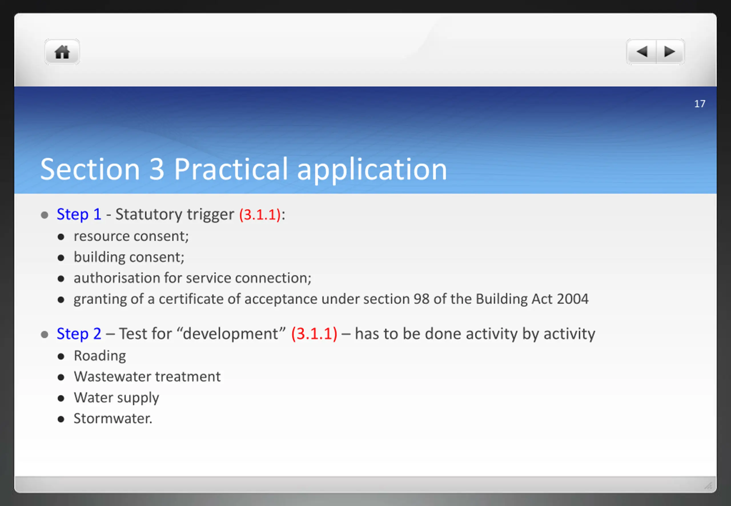HomeButton.png 17 Section 3 Practical application Step 1 - Statutory trigger (3.1.1): resource consent; building consent; authorisation for service connection; granting of a certificate of acceptance under section 98 of the Building Act 2004 Step 2 Test for development (3.1.1) has to be done activity by activity Roading Wastewater treatment Water supply Stormwater.
