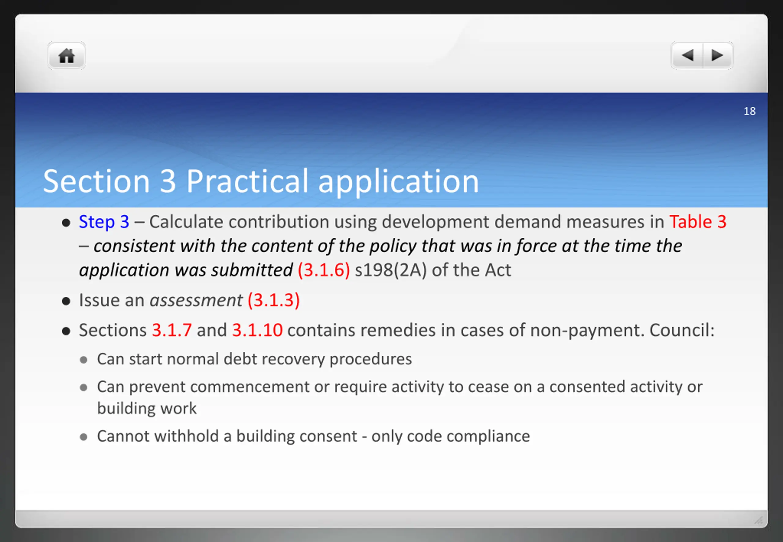 HomeButton.png 18 Section 3 Practical application Step 3 Calculate contribution using development demand measures in Table 3 consistent with the content of the policy that was in force at the time the application was submitted (3.1.6) s198(2A) of the Act Issue an assessment (3.1.3) Sections 3.1.7 and 3.1.10 contains remedies in cases of non-payment. Council: Can start normal debt recovery procedures Can prevent commencement or require activity to cease on a consented activity or building work Cannot withhold a building consent - only code compliance
