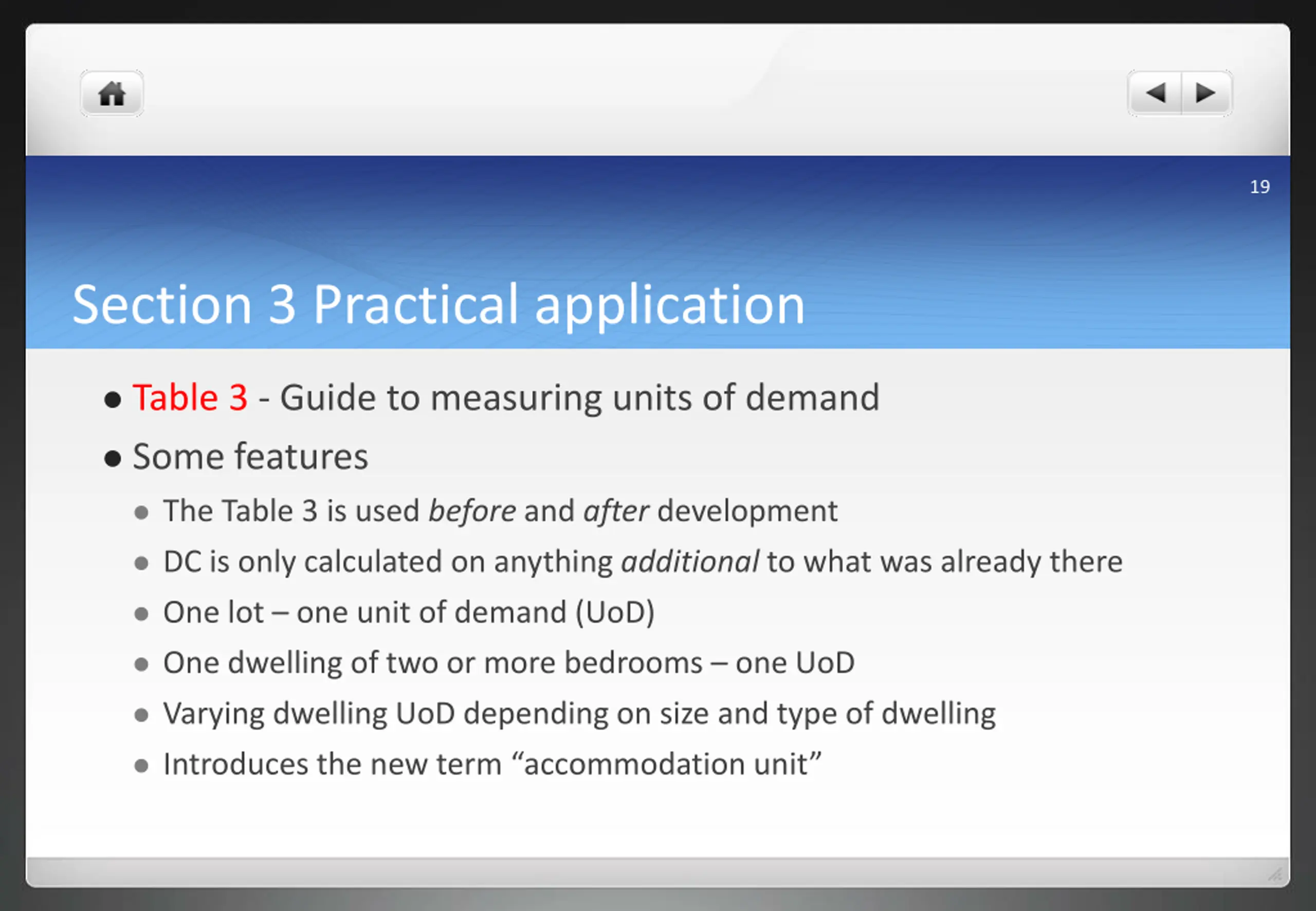 HomeButton.png 19 Section 3 Practical application Table 3 - Guide to measuring units of demand Some features The Table 3 is used before and after development DC is only calculated on anything additional to what was already there One lot one unit of demand (UoD) One dwelling of two or more bedrooms one UoD Varying dwelling UoD depending on size and type of dwelling Introduces the new term accommodation unit