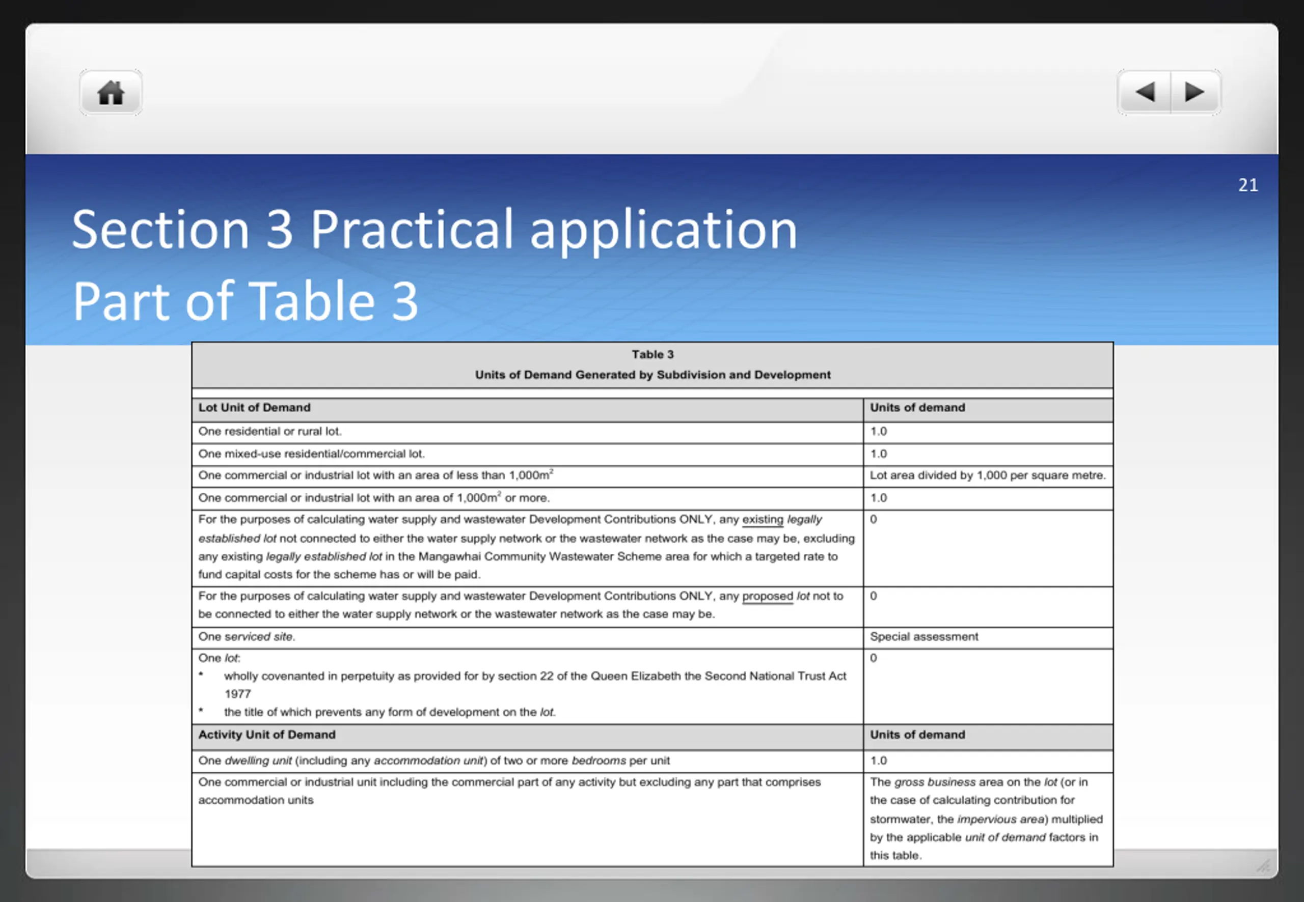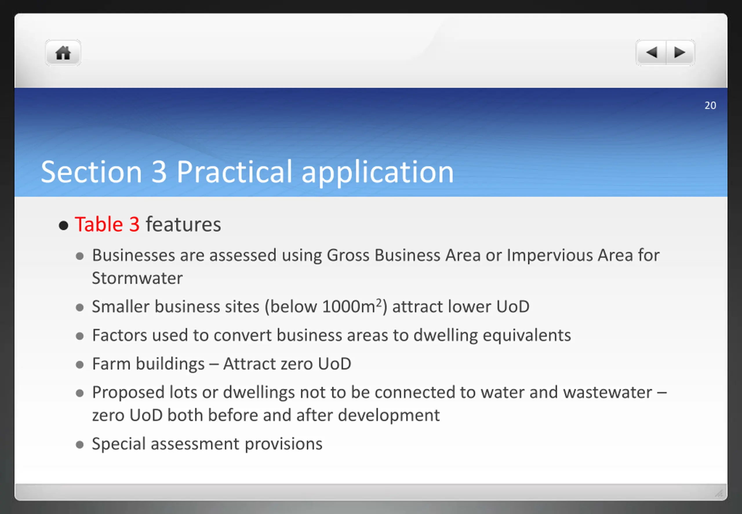 HomeButton.png 20 Section 3 Practical application Table 3 features Businesses are assessed using Gross Business Area or Impervious Area for Stormwater Smaller business sites (below 1000m2) attract lower UoD Factors used to convert business areas to dwelling equivalents Farm buildings Attract zero UoD Proposed lots or dwellings not to be connected to water and wastewater zero UoD both before and after development Special assessment provisions