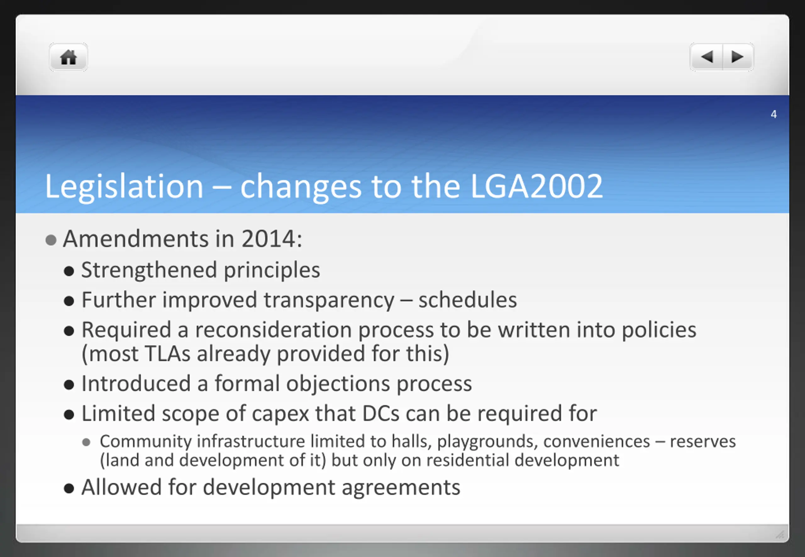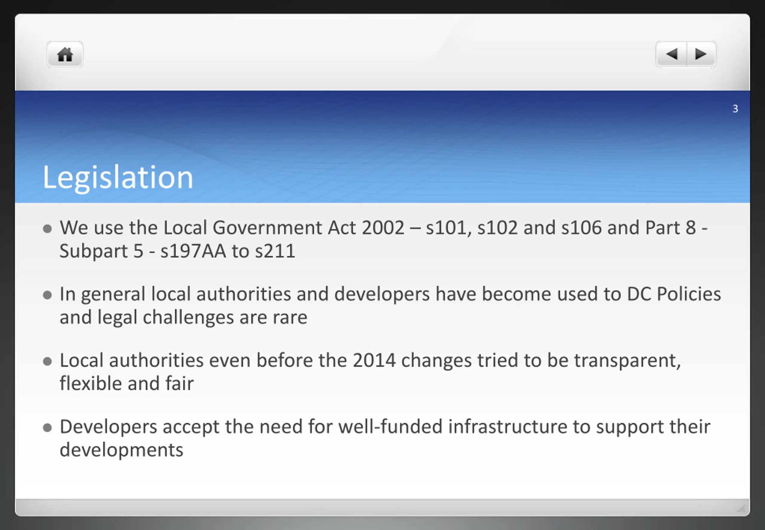 HomeButton.png 3 Legislation We use the Local Government Act 2002 s101, s102 and s106 and Part 8 - Subpart 5 - s197AA to s211 In general local authorities and developers have become used to DC Policies and legal challenges are rare Local authorities even before the 2014 changes tried to be transparent, flexible and fair Developers accept the need for well-funded infrastructure to support their developments
