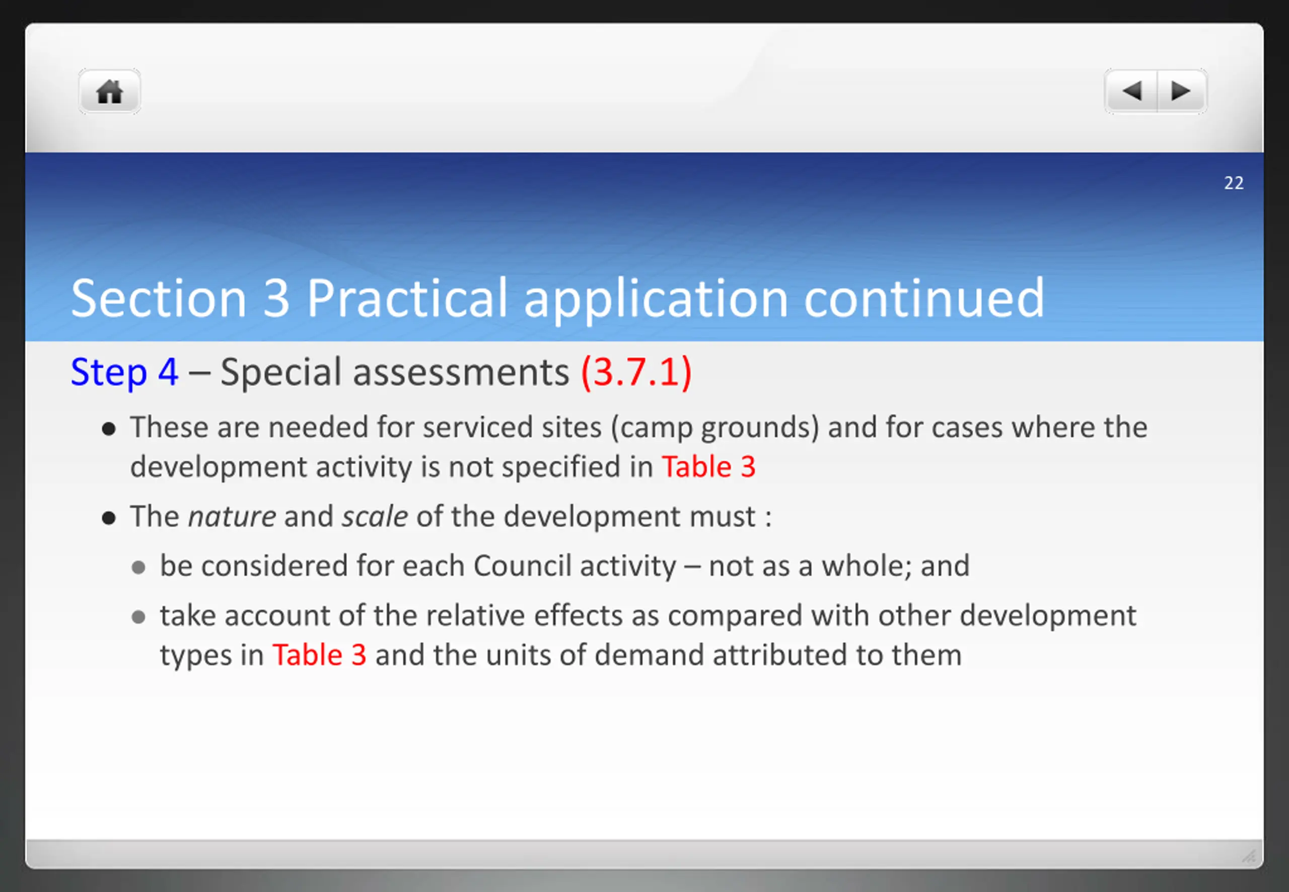 HomeButton.png 22 Section 3 Practical application continued Step 4 Special assessments (3.7.1) These are needed for serviced sites (camp grounds) and for cases where the development activity is not specified in Table 3 The nature and scale of the development must : be considered for each Council activity not as a whole; and take account of the relative effects as compared with other development types in Table 3 and the units of demand attributed to them
