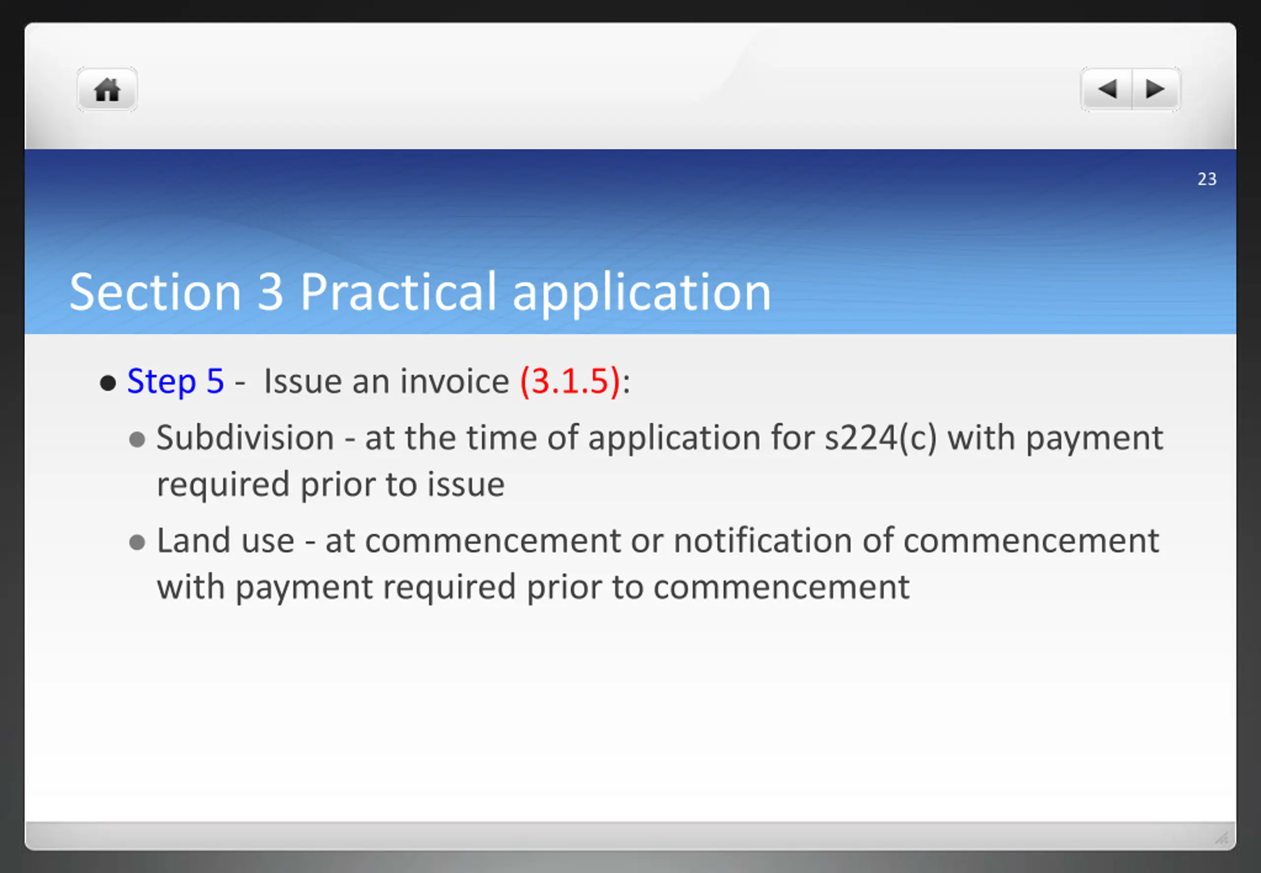 HomeButton.png 23 Section 3 Practical application Step 5 - Issue an invoice (3.1.5): Subdivision - at the time of application for s224(c) with payment required prior to issue Land use - at commencement or notification of commencement with payment required prior to commencement