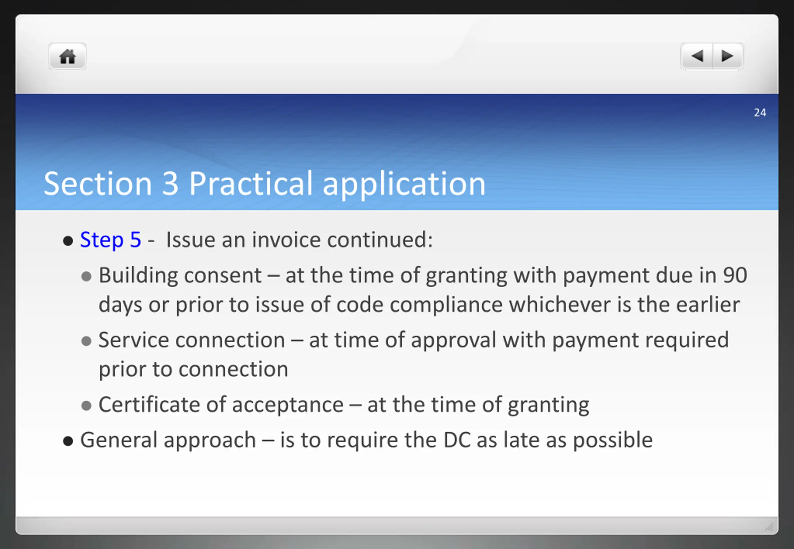 HomeButton.png 24 Section 3 Practical application Step 5 - Issue an invoice continued: Building consent at the time of granting with payment due in 90 days or prior to issue of code compliance whichever is the earlier Service connection at time of approval with payment required prior to connection Certificate of acceptance at the time of granting General approach is to require the DC as late as possible