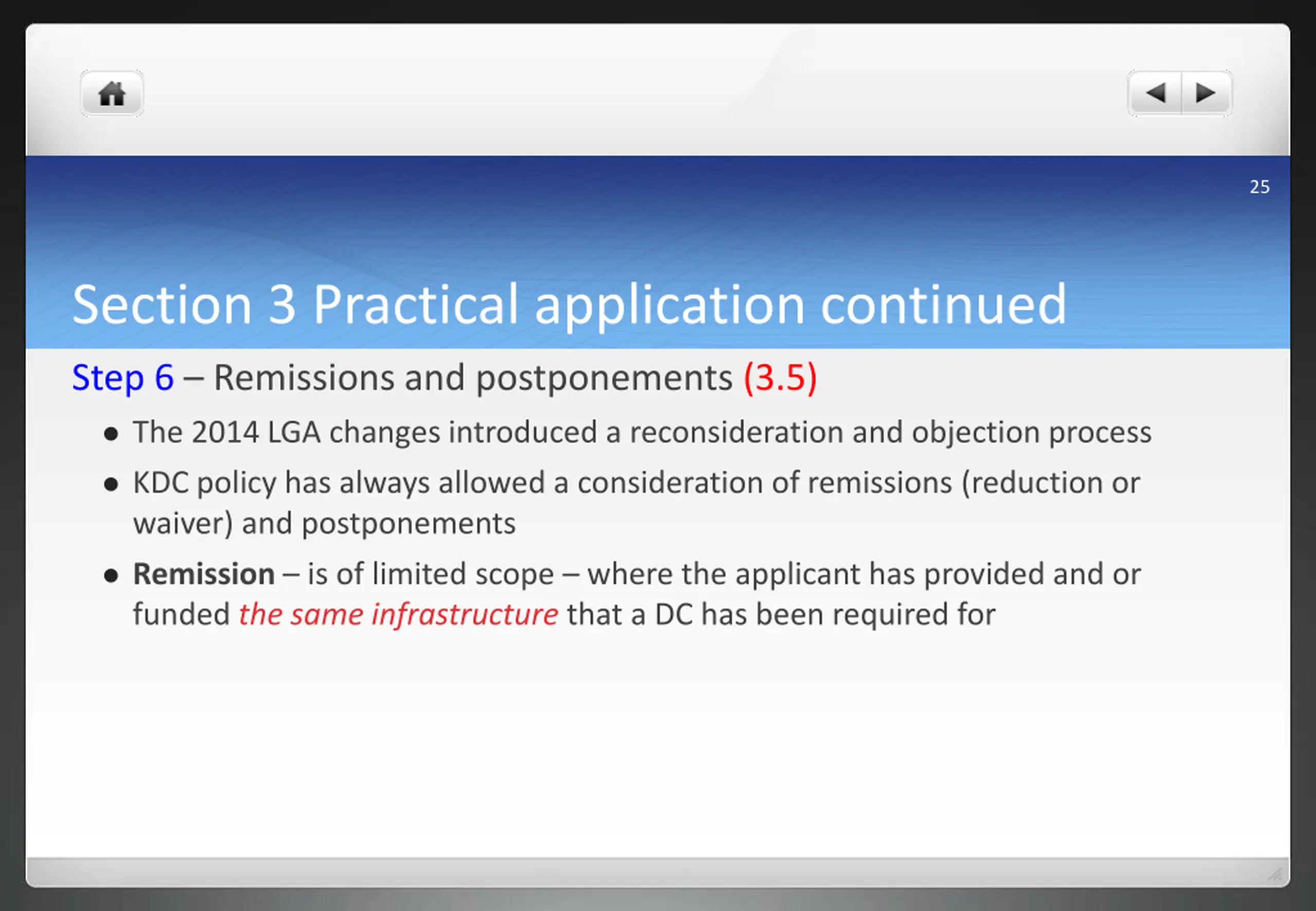 HomeButton.png 25 Section 3 Practical application continued Step 6 Remissions and postponements (3.5) The 2014 LGA changes introduced a reconsideration and objection process KDC policy has always allowed a consideration of remissions (reduction or waiver) and postponements Remission is of limited scope where the applicant has provided and or funded the same infrastructure that a DC has been required for