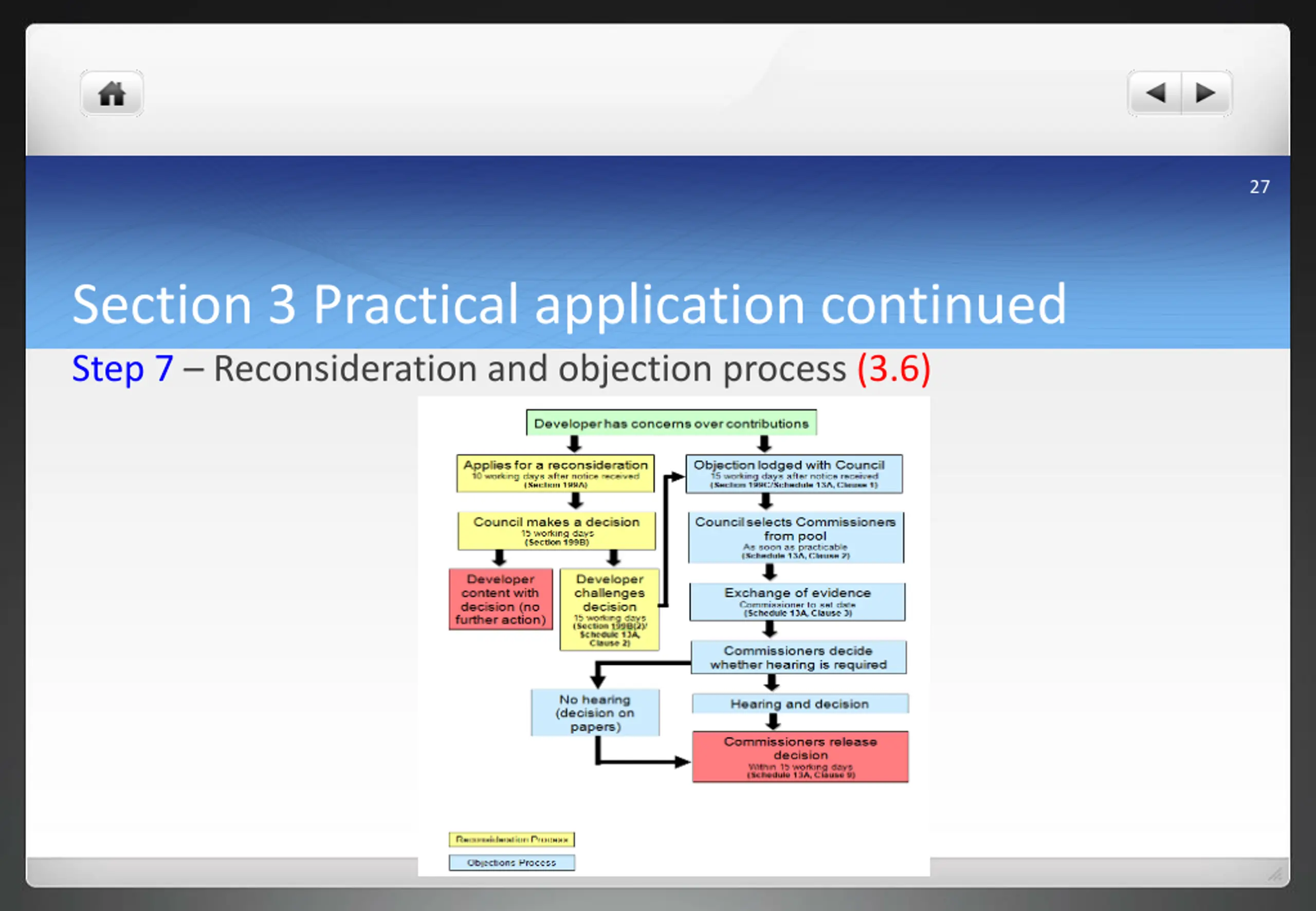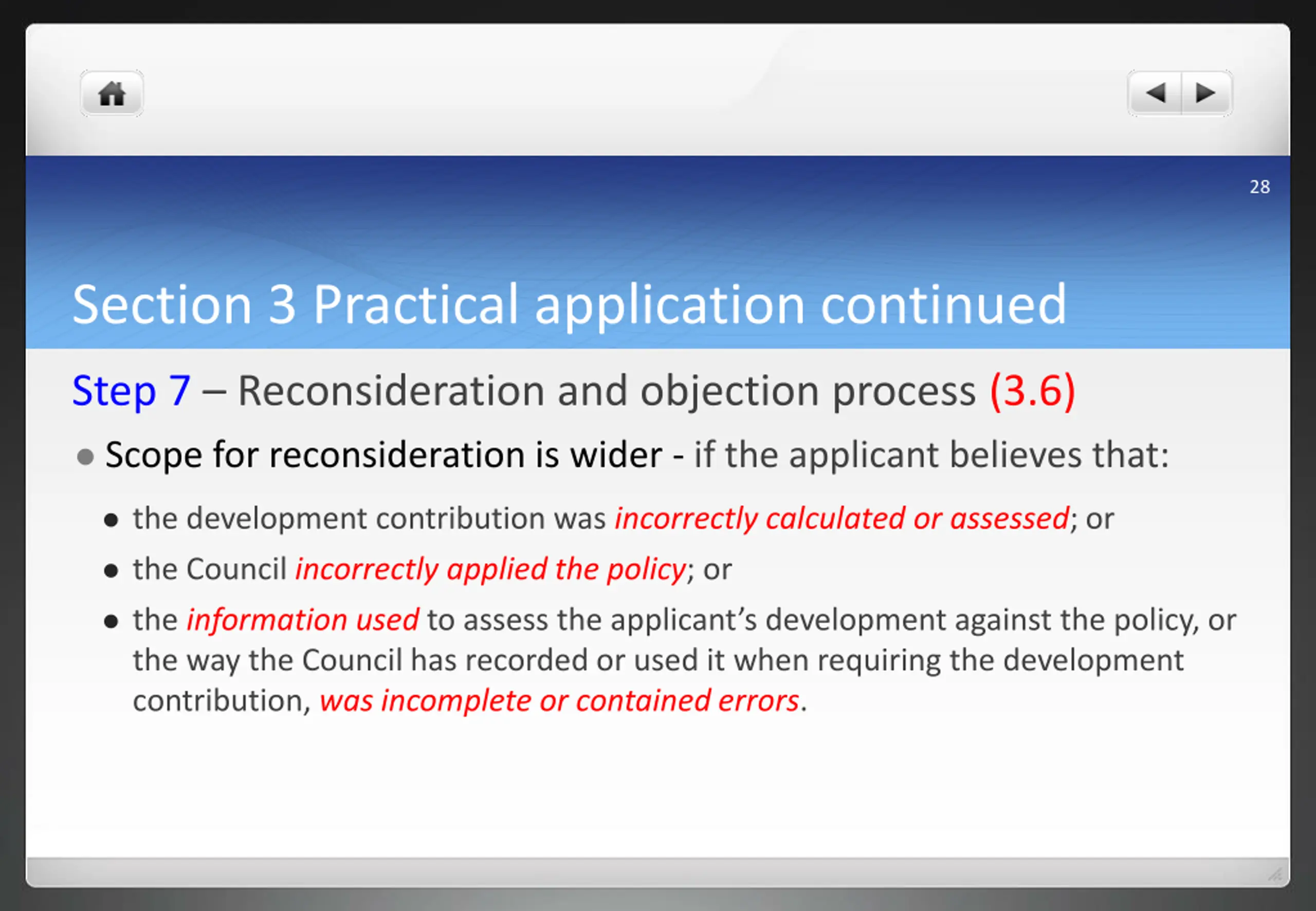 HomeButton.png 28 Section 3 Practical application continued Step 7 Reconsideration and objection process (3.6) Scope for reconsideration is wider - if the applicant believes that: the development contribution was incorrectly calculated or assessed; or the Council incorrectly applied the policy; or the information used to assess the applicant s development against the policy, or the way the Council has recorded or used it when requiring the development contribution, was incomplete or contained errors.
