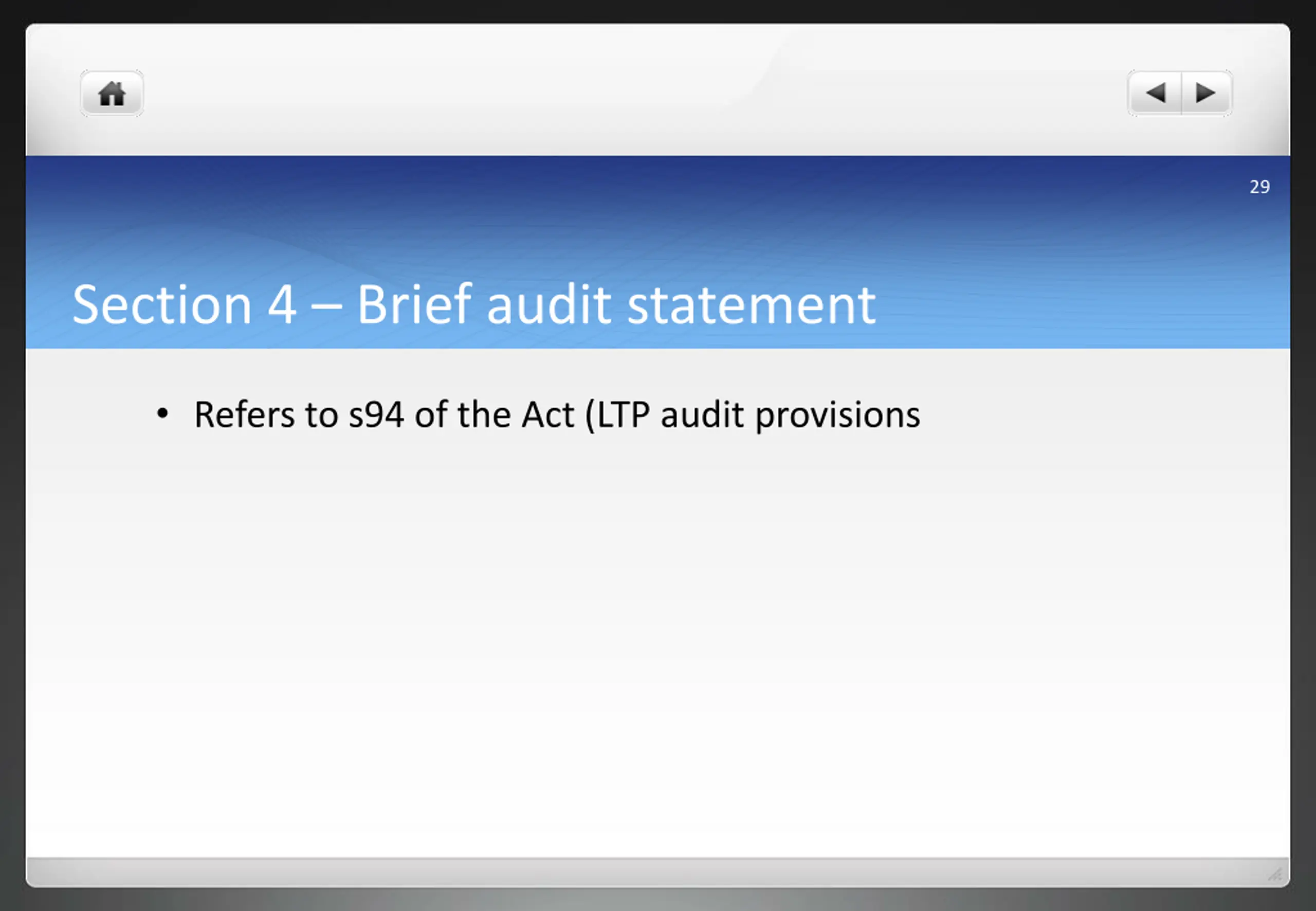 HomeButton.png 29 Section 4 Brief audit statement Refers to s94 of the Act (LTP audit provisions