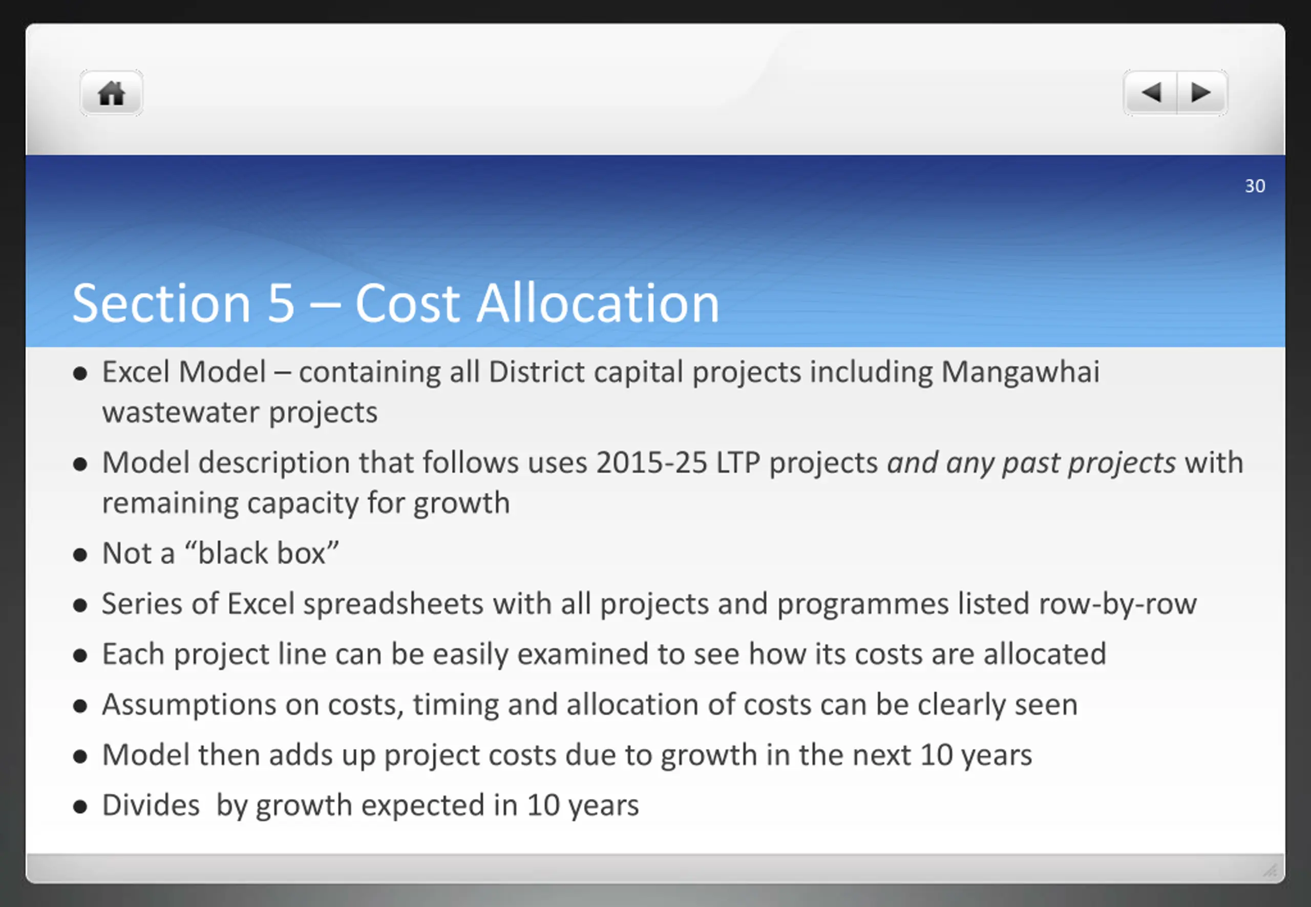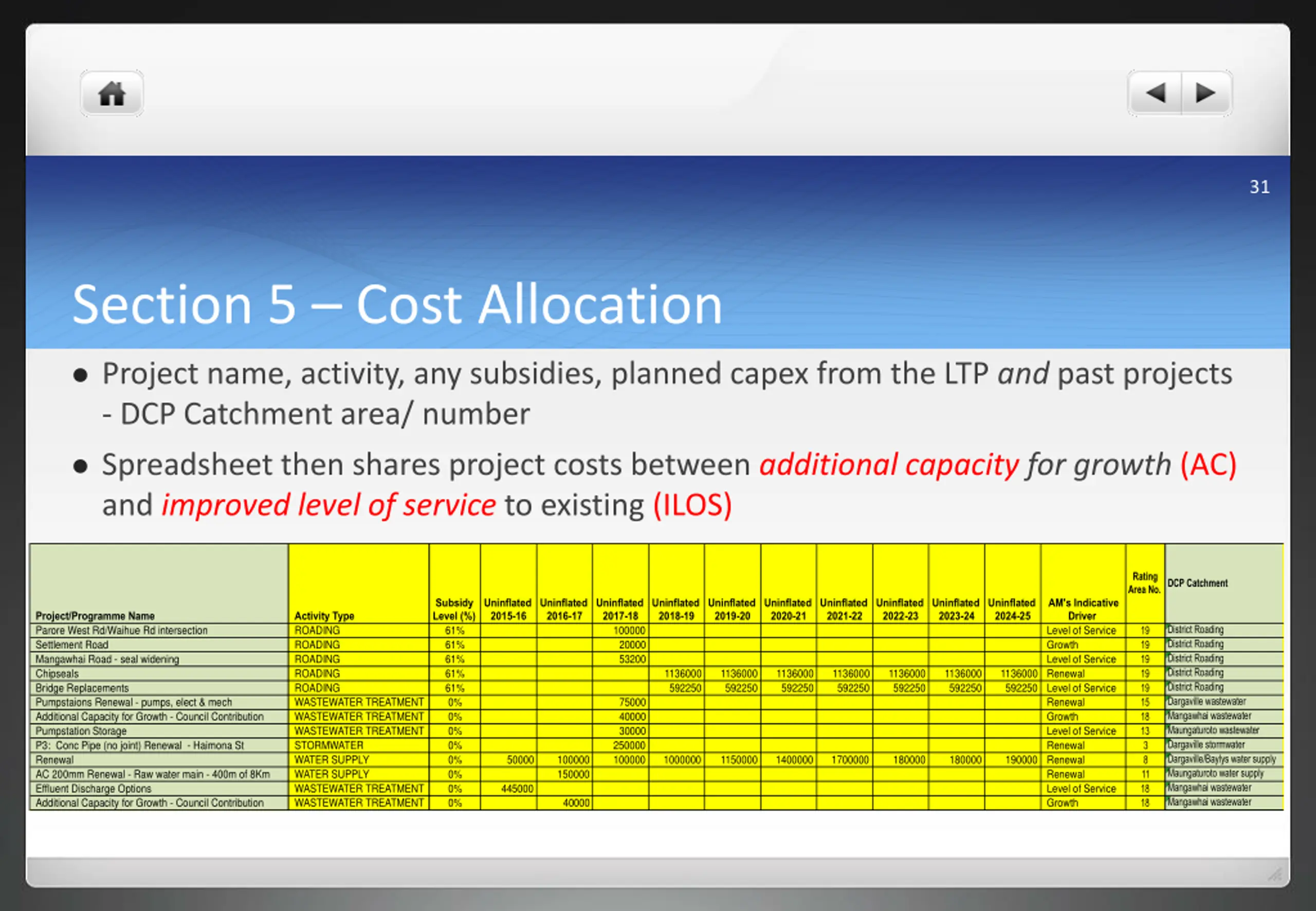 HomeButton.png 30 Section 5 Cost Allocation Excel Model containing all District capital projects including Mangawhai wastewater projects Model description that follows uses 2015-25 LTP projects and any past projects with remaining capacity for growth Not a black box Series of Excel spreadsheets with all projects and programmes listed row-by-row Each project line can be easily examined to see how its costs are allocated Assumptions on costs, timing and allocation of costs can be clearly seen Model then adds up project costs due to growth in the next 10 years Divides by growth expected in 10 years