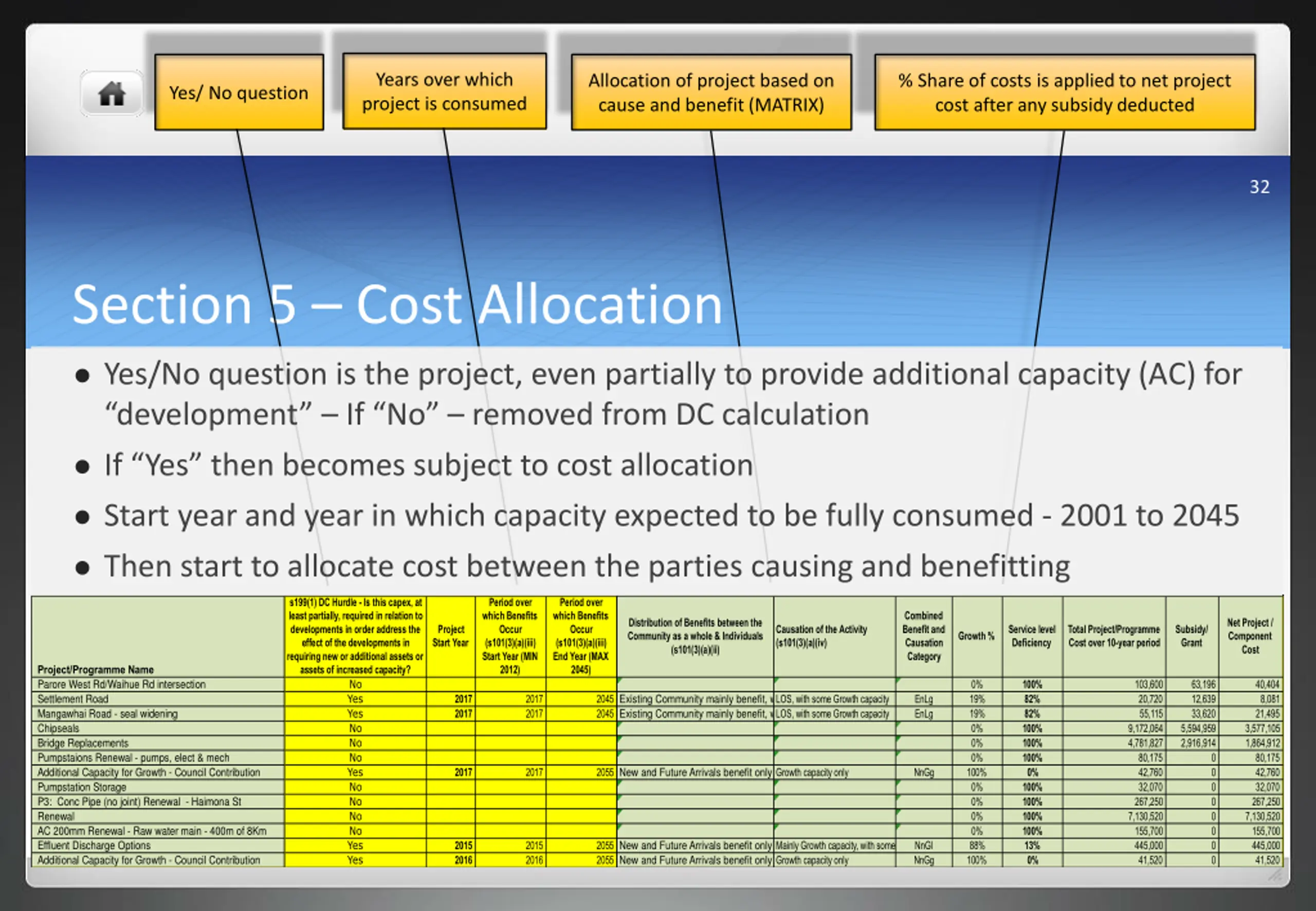HomeButton.png Years over which project is consumed Allocation of project based on cause and benefit (MATRIX) % Share of costs is applied to net project cost after any subsidy deducted Yes/ No question 32 Section 5 Cost Allocation Yes/No question is the project, even partially to provide additional capacity (AC) for development If No removed from DC calculation If Yes then becomes subject to cost allocation Start year and year in which capacity expected to be fully consumed - 2001 to 2045 Then start to allocate cost between the parties causing and benefitting s199(1) DC Hurdle - Is this capex, at least partially, required in relation to developments in order address the effect of the developments in requiring new or additional assets or assets of increased capacity? No Yes Yes No No No Yes No No No No Yes Yes Period over which Benefits Occur (s101(3)(a)(iii) Start Year (MIN 2012) Period over which Benefits Occur (s101(3)(a)(iii) End Year (MAX 2045) Combined Benefit and Causation Category Distribution of Benefits between the Community as a whole & Individuals (s101(3)(a)(ii) Net Project / Component Cost Project Start Year Causation of the Activity (s101(3)(a)(iv) Service level Deficiency Total Project/Programme Cost over 10-year period Subsidy/ Grant Growth % Project/Programme Name Parore West Rd/Waihue Rd intersection Settlement Road Mangawhai Road - seal widening Chipseals Bridge Replacements Pumpstaions Renewal - pumps, elect & mech Additional Capacity for Growth - Council Contribution Pumpstation Storage P3: Conc Pipe (no joint) Renewal - Haimona St Renewal AC 200mm Renewal - Raw water main - 400m of 8Km Effluent Discharge Options Additional Capacity for Growth - Council Contribution 0% 19% 19% 0% 0% 0% 100% 0% 0% 0% 0% 88% 100% 100% 82% 82% 100% 100% 100% 0% 100% 100% 100% 100% 13% 0% 103,600 20,720 55,115 9,172,064 4,781,827 80,175 42,760 32,070 267,250 7,130,520 155,700 445,000 41,520 63,196 12,639 33,620 5,594,959 2,916,914 40,404 8,081 21,495 3,577,105 1,864,912 80,175 42,760 32,070 267,250 7,130,520 155,700 445,000 41,520 Existing Community mainly benefit, w Existing Community mainly benefit, w 2017 2017 2017 2017 2045 2045 LOS, with some Growth capacity LOS, with some Growth capacity EnLg EnLg 0 0 0 0 0 0 0 0 New and Future Arrivals benefit only 2017 2017 2055 Growth capacity only NnGg New and Future Arrivals benefit only New and Future Arrivals benefit only 2015 2016 2015 2016 2055 2055 Mainly Growth capacity, with some L Growth capacity only NnGl NnGg