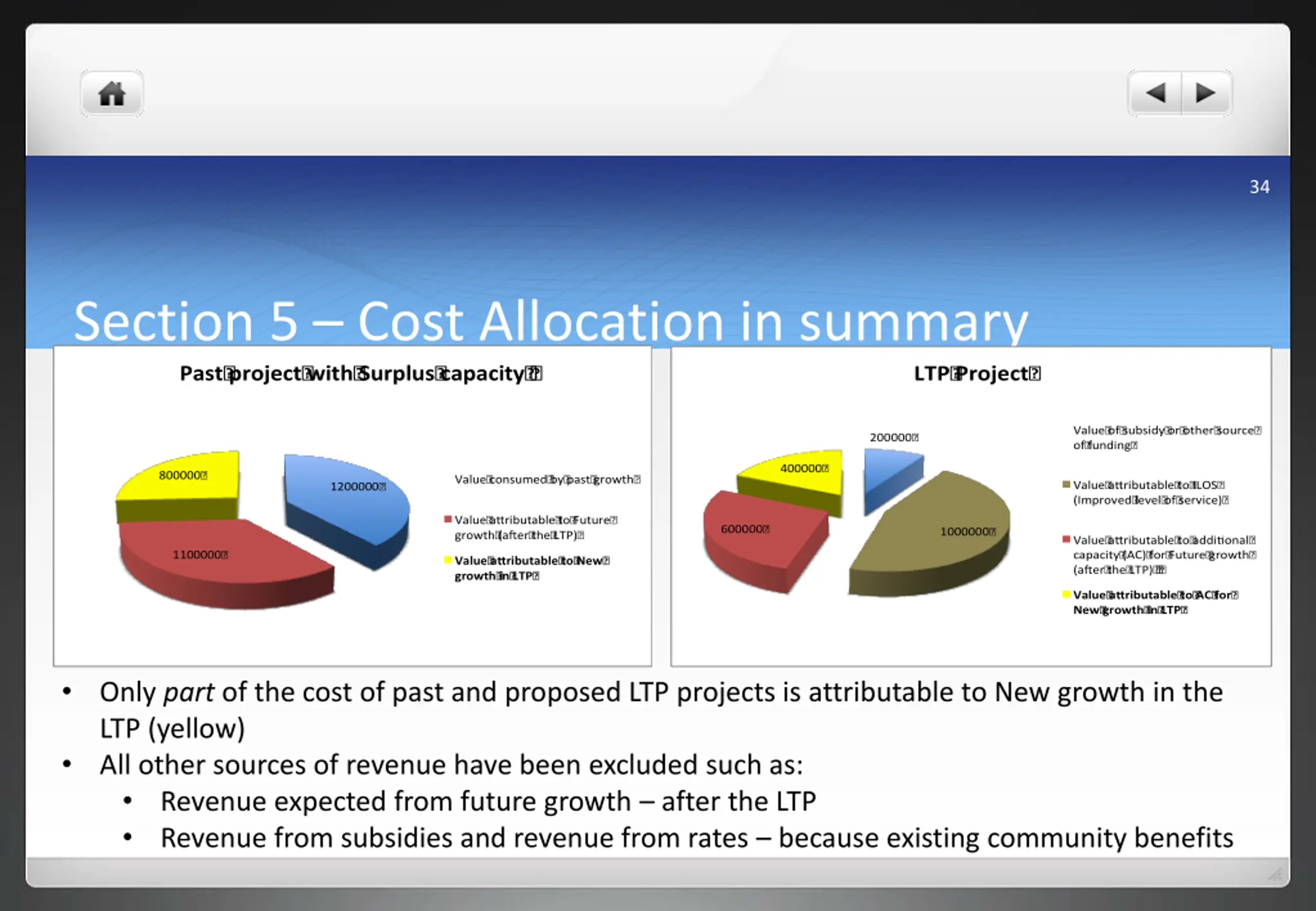 HomeButton.png 34 Section 5 Cost Allocation in summary Past? project? with? Surplus? capacity? ? LTP? Project? Value? of? subsidy? or? other? source? of? funding? 200000? 400000? 800000? Value? consumed? by? past? growth? Value? a ributable? to? ILOS? (Improved? level? of? service)? 1200000? Value? a ributable? to? Future? growth? (a er? the? LTP)? 600000? 1000000? Value? a ributable? to? addi onal? capacity? (AC)? for? Future? growth? (a er? the? LTP)? ? ? 1100000? Value? a ributable? to? New? growth? in? LTP? Value? a ributable? to? AC? for? New? growth? in? LTP? Only part of the cost of past and proposed LTP projects is attributable to New growth in the LTP (yellow) All other sources of revenue have been excluded such as: Revenue expected from future growth after the LTP Revenue from subsidies and revenue from rates because existing community benefits