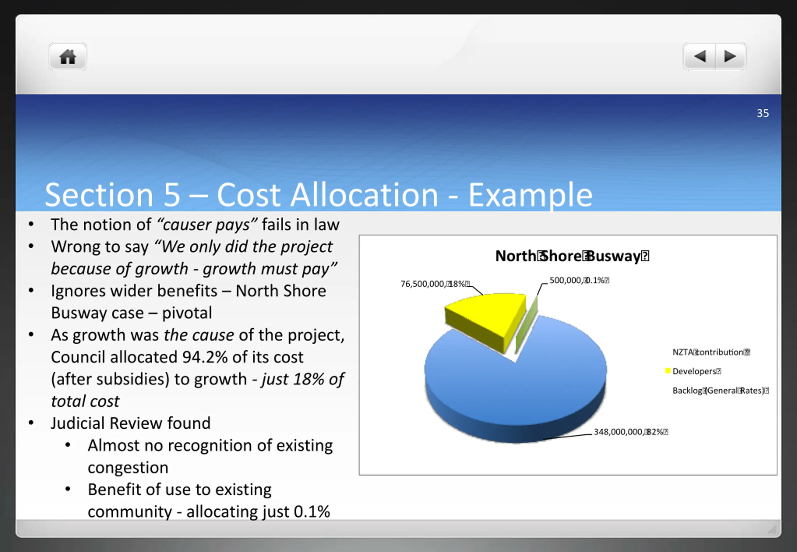 HomeButton.png 35 Section 5 Cost Allocation - Example The notion of causer pays fails in law Wrong to say We only did the project because of growth - growth must pay Ignores wider benefits North Shore Busway case pivotal As growth was the cause of the project, Council allocated 94.2% of its cost (after subsidies) to growth - just 18% of total cost Judicial Review found Almost no recognition of existing congestion Benefit of use to existing community - allocating just 0.1% North? Shore? Busway? 500,000,? 0.1%? 76,500,000,? 18%? NZTA? contribu on? ? Developers? Backlog? (General? Rates)? 348,000,000,? 82%?