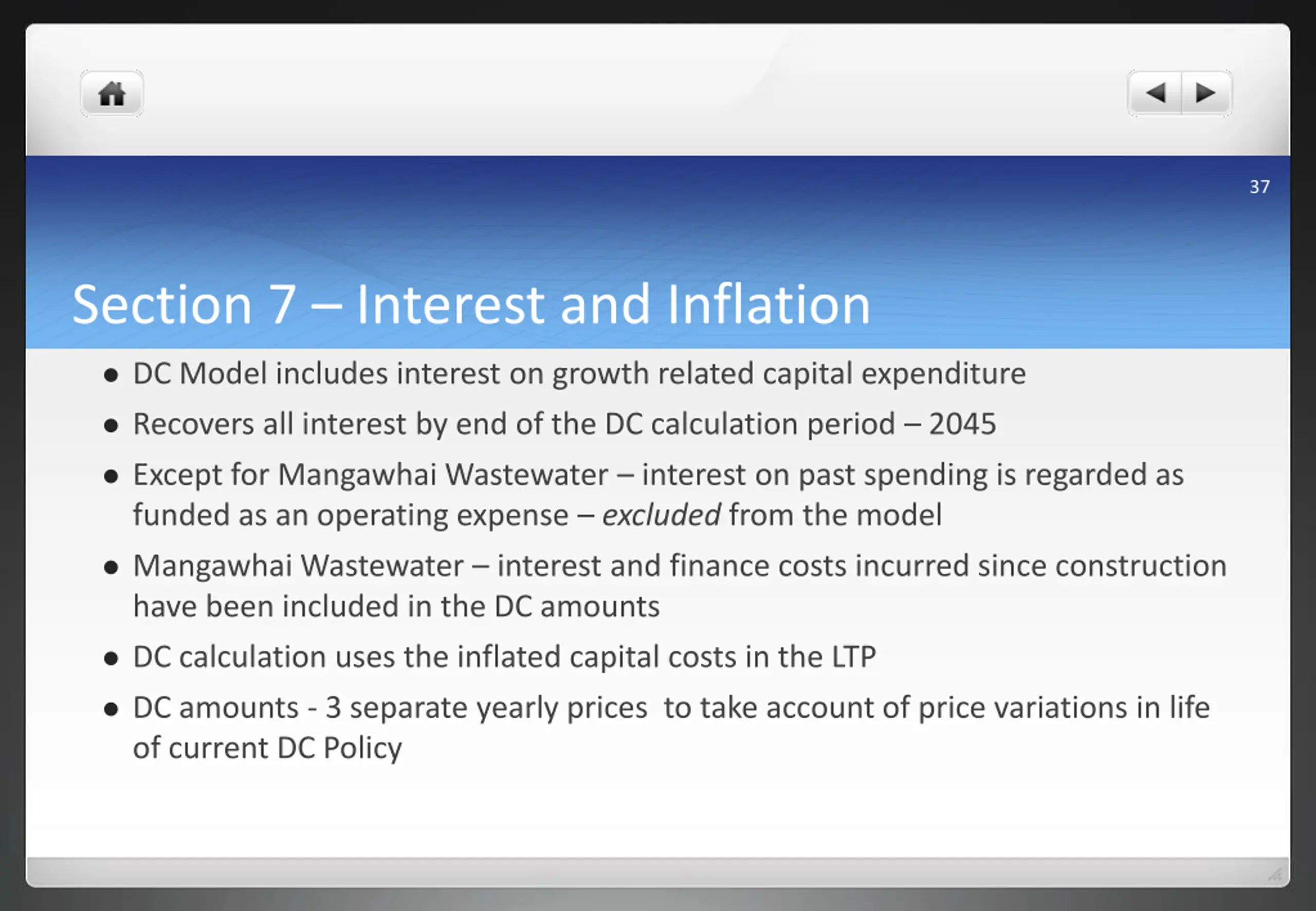 HomeButton.png 37 Section 7 Interest and Inflation DC Model includes interest on growth related capital expenditure Recovers all interest by end of the DC calculation period 2045 Except for Mangawhai Wastewater interest on past spending is regarded as funded as an operating expense excluded from the model Mangawhai Wastewater interest and finance costs incurred since construction have been included in the DC amounts DC calculation uses the inflated capital costs in the LTP DC amounts - 3 separate yearly prices to take account of price variations in life of current DC Policy
