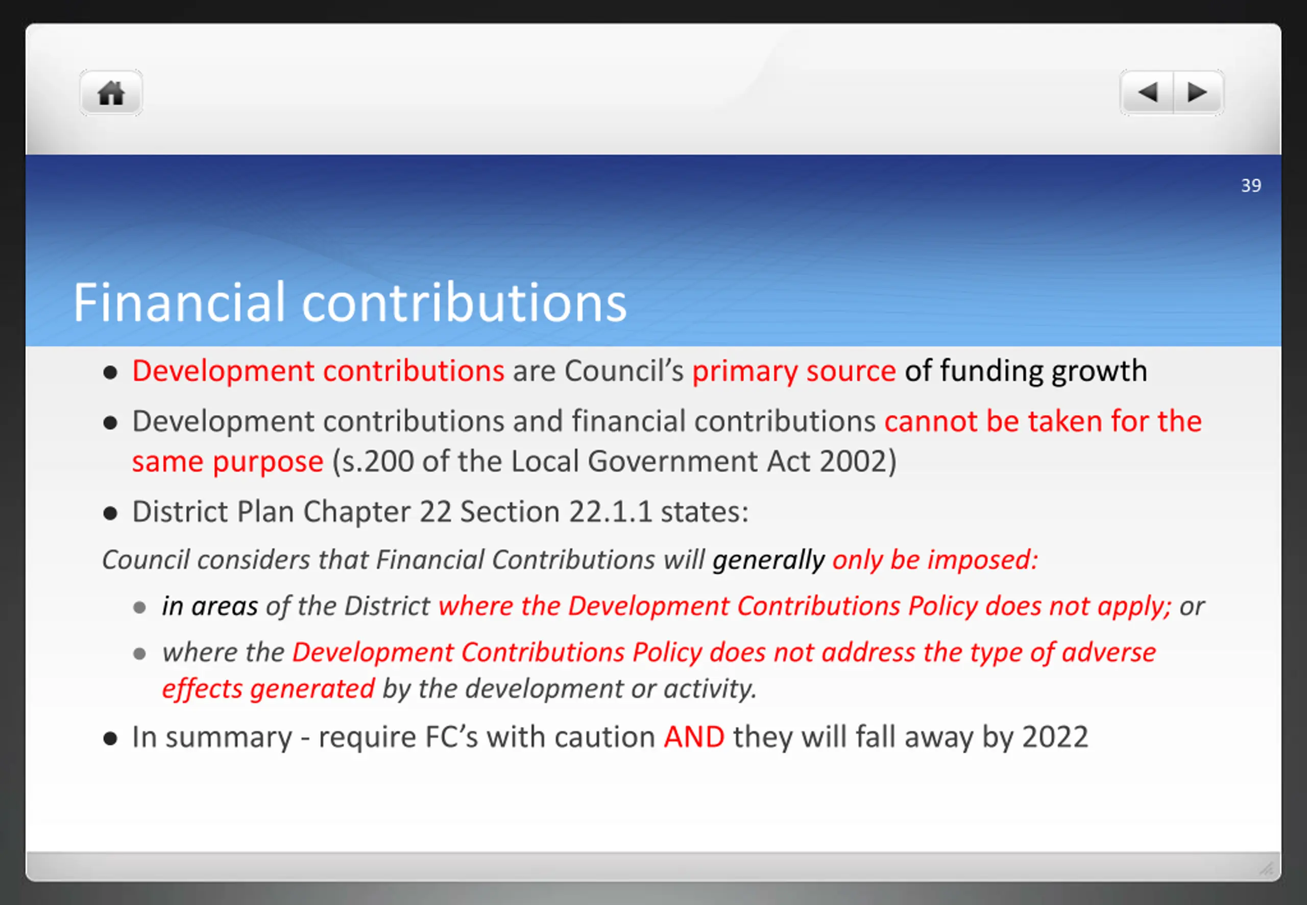 HomeButton.png 39 Financial contributions Development contributions are Council s primary source of funding growth Development contributions and financial contributions cannot be taken for the same purpose (s.200 of the Local Government Act 2002) District Plan Chapter 22 Section 22.1.1 states: Council considers that Financial Contributions will generally only be imposed: in areas of the District where the Development Contributions Policy does not apply; or where the Development Contributions Policy does not address the type of adverse effects generated by the development or activity. In summary - require FC s with caution AND they will fall away by 2022