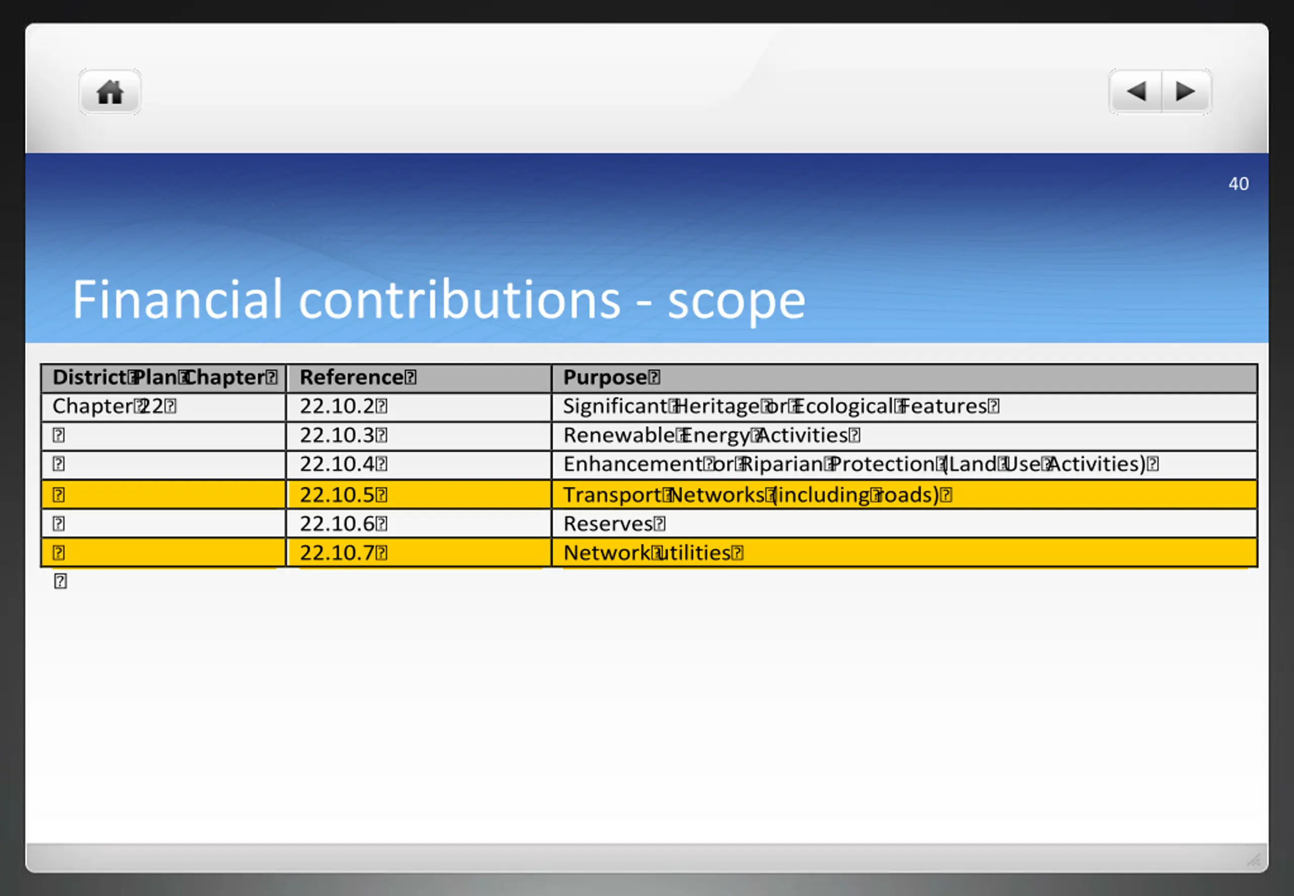 HomeButton.png 40 Financial contributions - scope District? Plan? Chapter? Reference? Chapter? 22? ? ? ? ? ? ? Purpose? Significant? Heritage? or? Ecological? Features? Renewable? Energy? Activities? Enhancement?or? Riparian? Protection? (Land? Use? Activities)? Transport? Networks? (including? roads)? Reserves? Network? utilities? 22.10.2? 22.10.3? 22.10.4? 22.10.5? 22.10.6? 22.10.7?