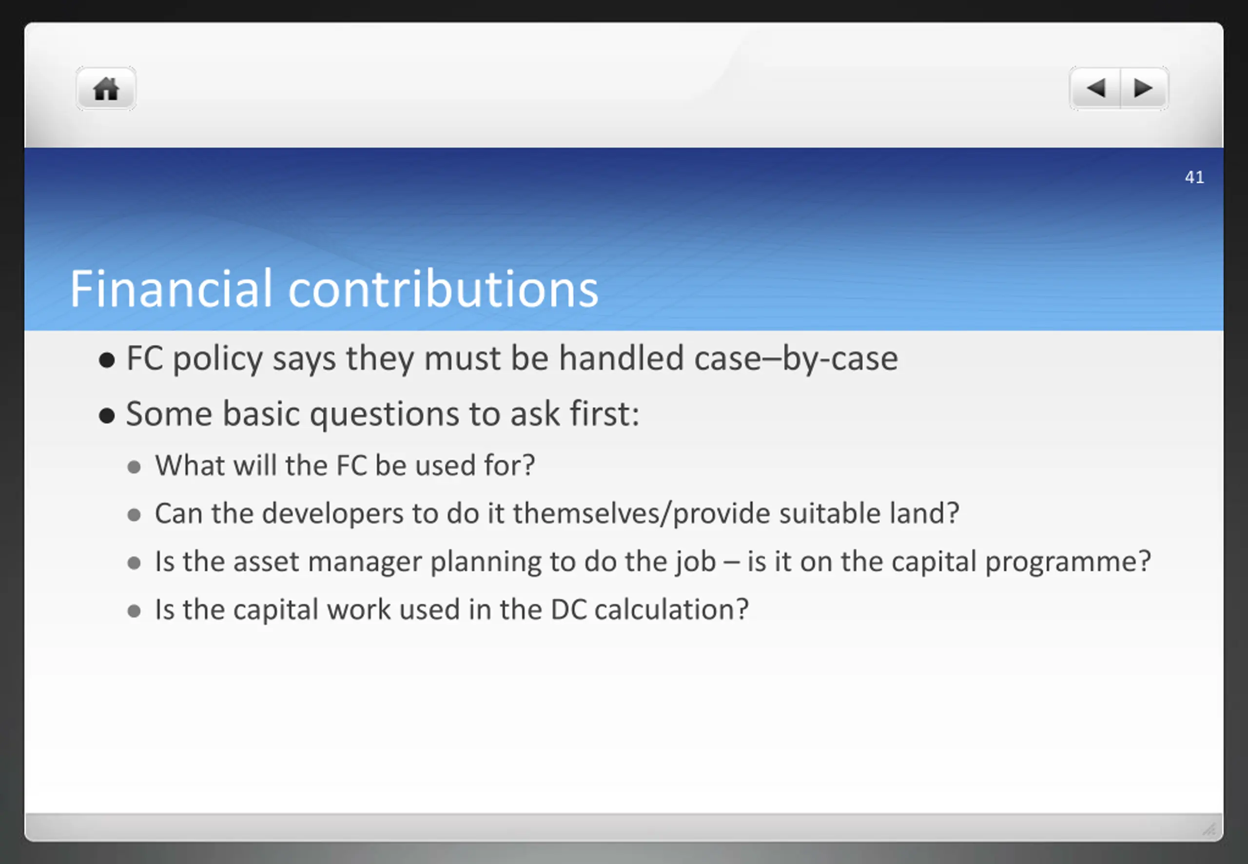 HomeButton.png 41 Financial contributions FC policy says they must be handled case by-case Some basic questions to ask first: What will the FC be used for? Can the developers to do it themselves/provide suitable land? Is the asset manager planning to do the job is it on the capital programme? Is the capital work used in the DC calculation?