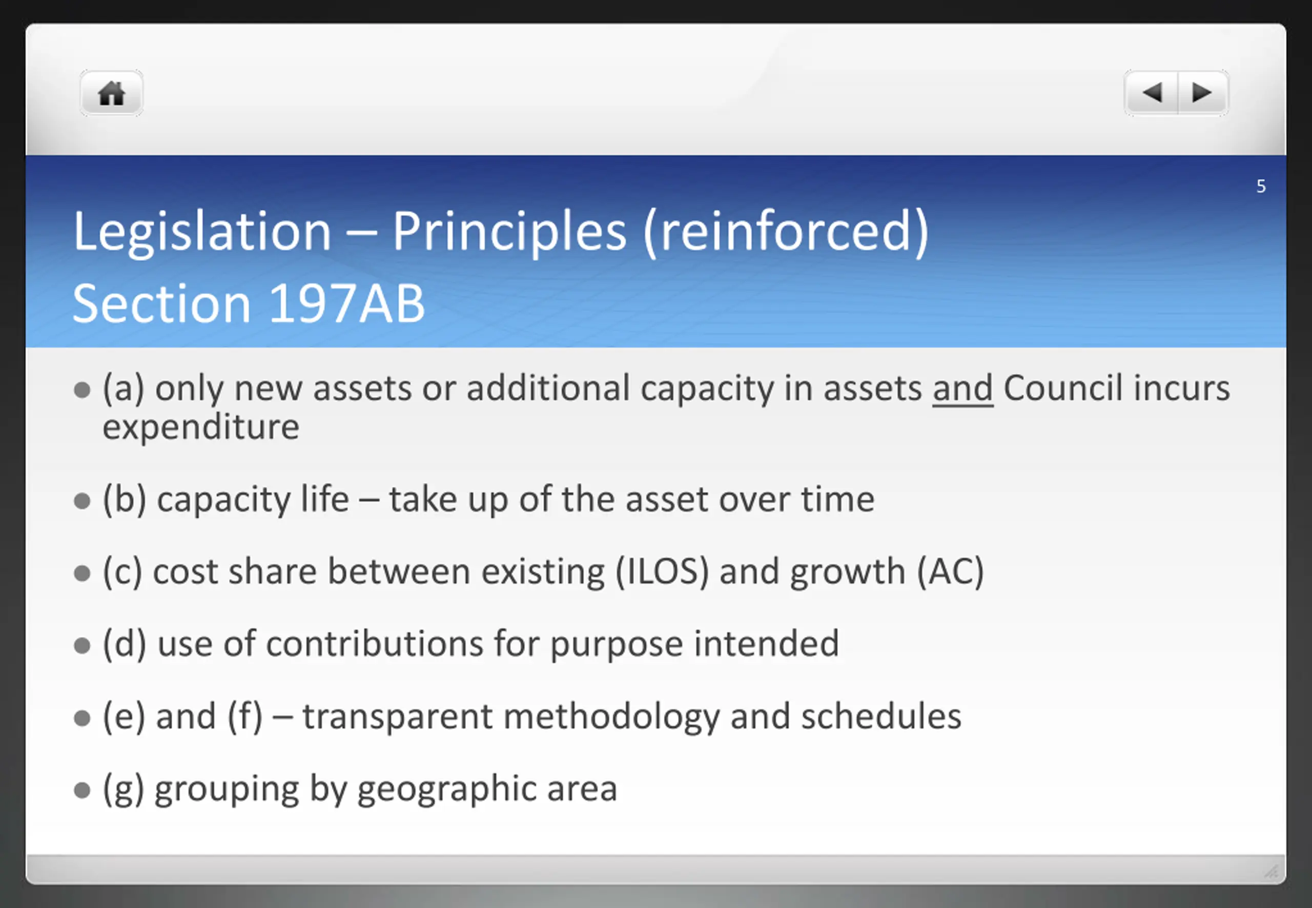 HomeButton.png 5 Legislation Principles (reinforced) Section 197AB (a) only new assets or additional capacity in assets and Council incurs expenditure (b) capacity life take up of the asset over time (c) cost share between existing (ILOS) and growth (AC) (d) use of contributions for purpose intended (e) and (f) transparent methodology and schedules (g) grouping by geographic area