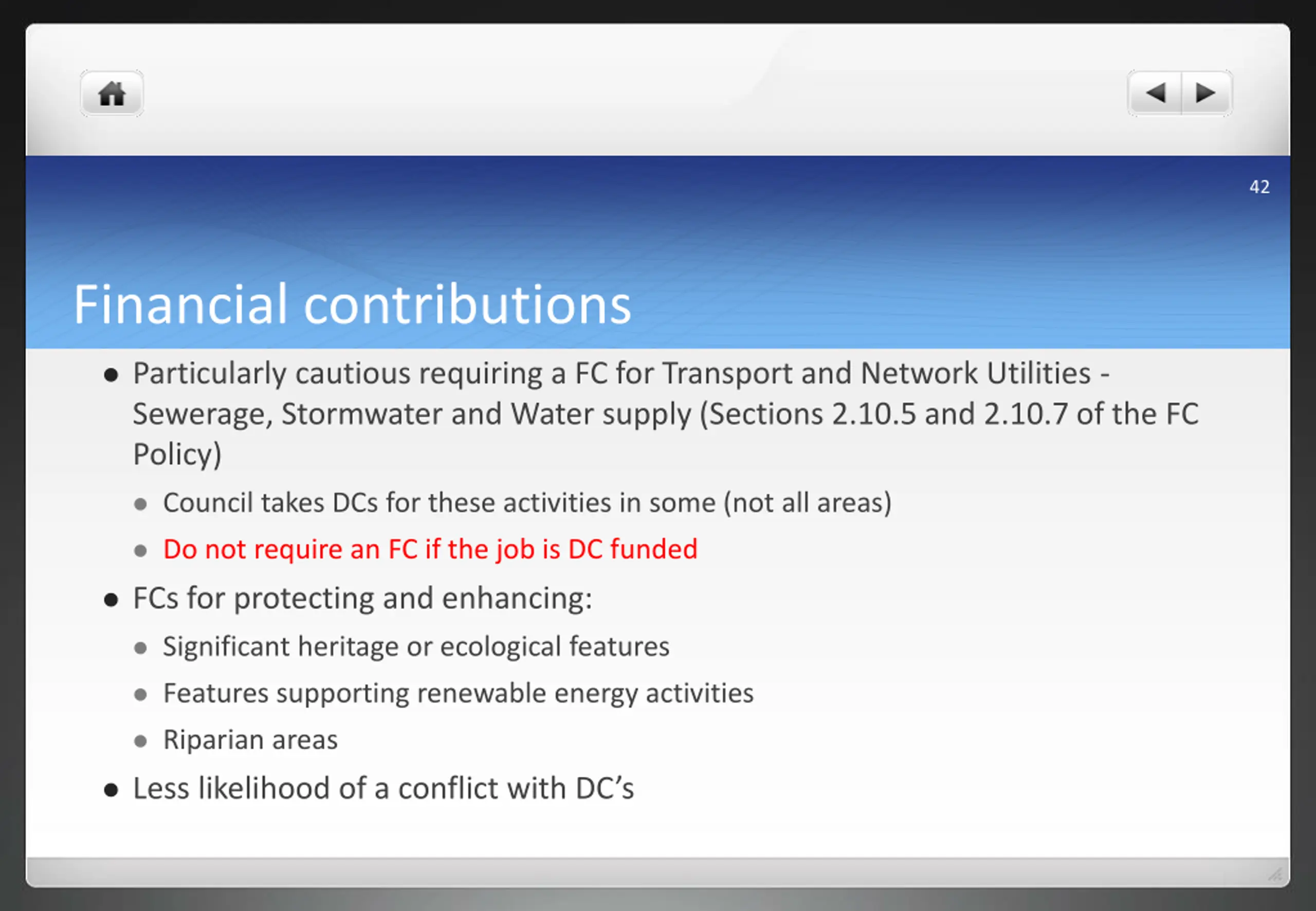 HomeButton.png 42 Financial contributions Particularly cautious requiring a FC for Transport and Network Utilities - Sewerage, Stormwater and Water supply (Sections 2.10.5 and 2.10.7 of the FC Policy) Council takes DCs for these activities in some (not all areas) Do not require an FC if the job is DC funded FCs for protecting and enhancing: Significant heritage or ecological features Features supporting renewable energy activities Riparian areas Less likelihood of a conflict with DC s