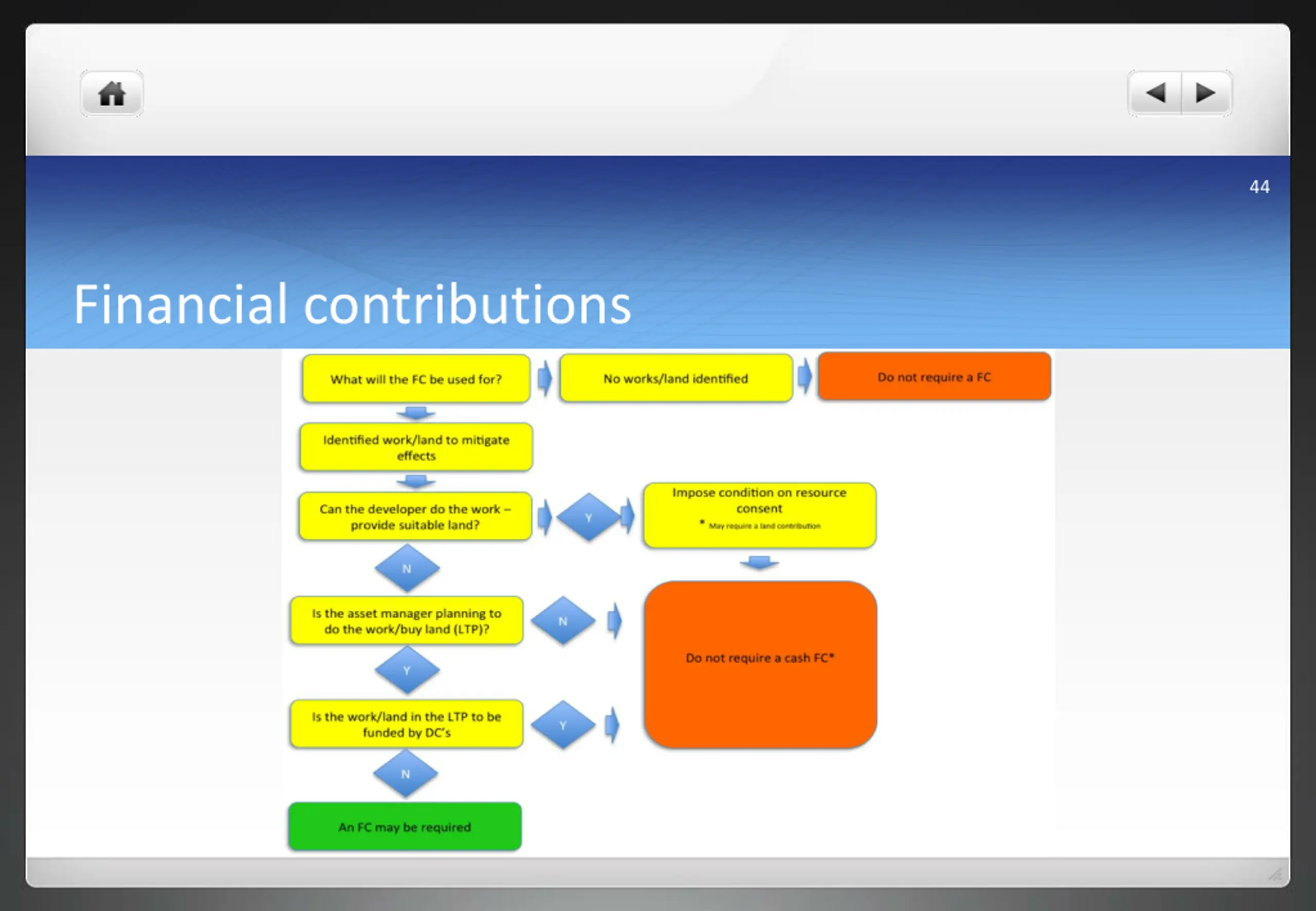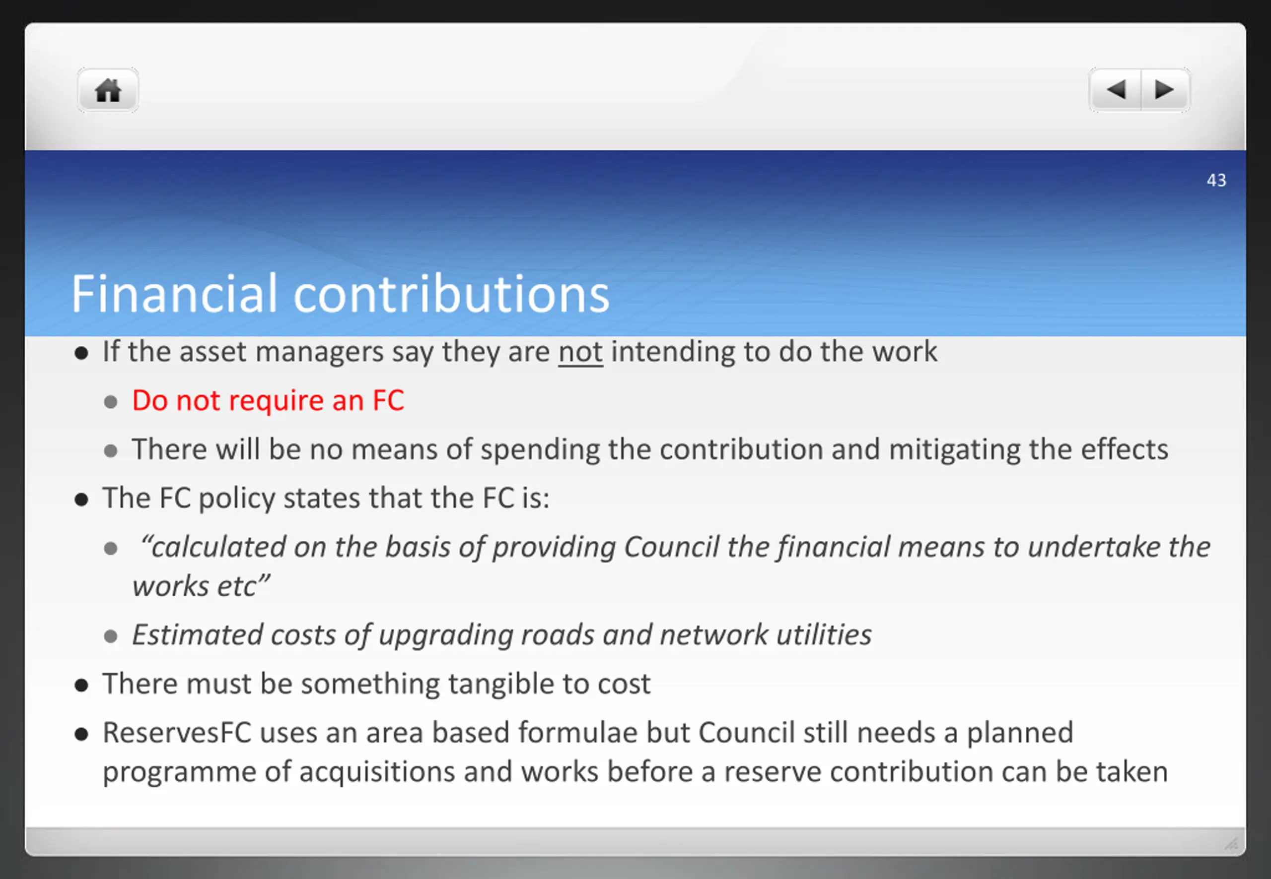 HomeButton.png 43 Financial contributions If the asset managers say they are not intending to do the work Do not require an FC There will be no means of spending the contribution and mitigating the effects The FC policy states that the FC is: calculated on the basis of providing Council the financial means to undertake the works etc Estimated costs of upgrading roads and network utilities There must be something tangible to cost ReservesFC uses an area based formulae but Council still needs a planned programme of acquisitions and works before a reserve contribution can be taken
