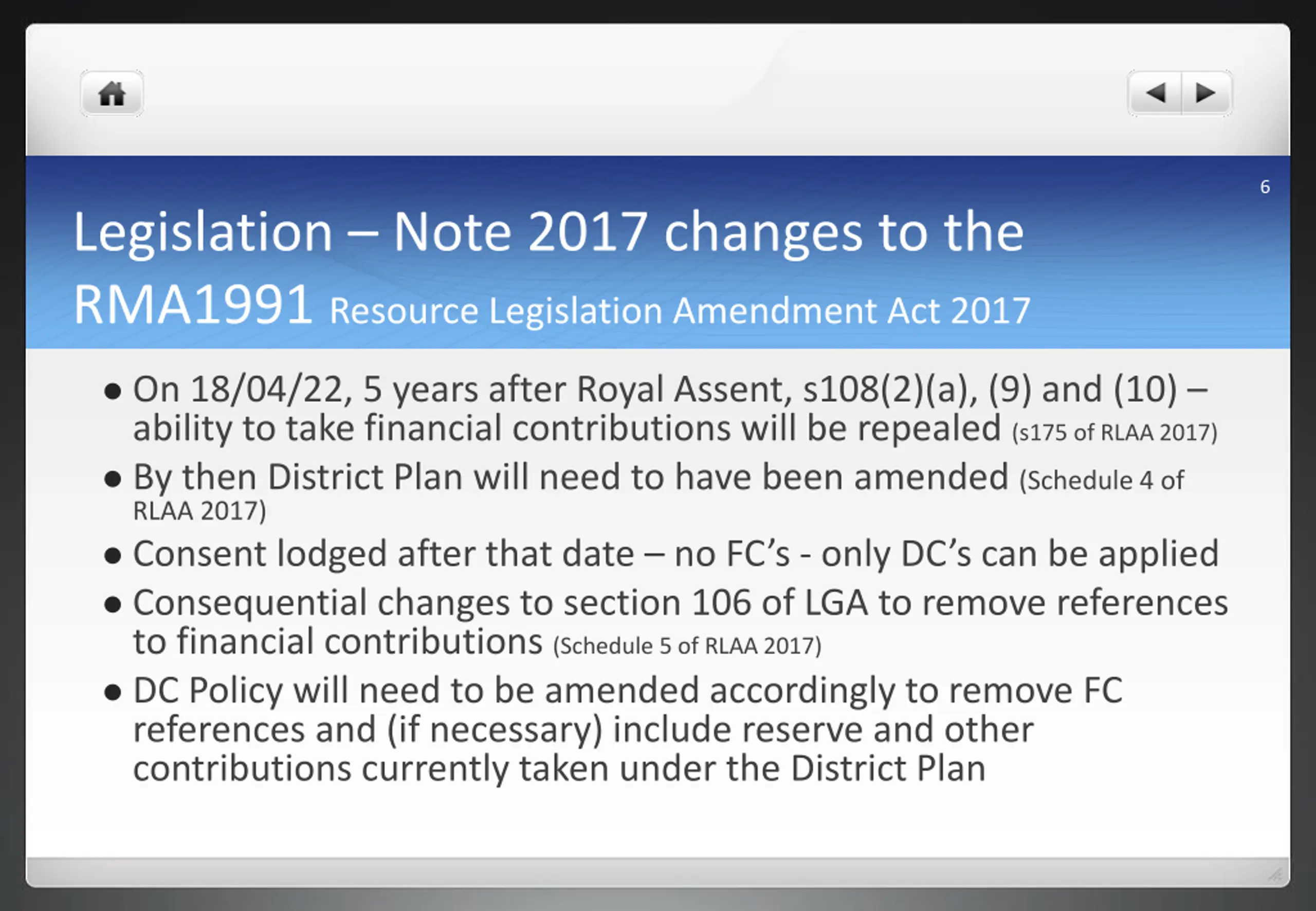 HomeButton.png 6 Legislation Note 2017 changes to the RMA1991 Resource Legislation Amendment Act 2017 On 18/04/22, 5 years after Royal Assent, s108(2)(a), (9) and (10) ability to take financial contributions will be repealed (s175 of RLAA 2017) By then District Plan will need to have been amended (Schedule 4 of RLAA 2017) Consent lodged after that date no FC s - only DC s can be applied Consequential changes to section 106 of LGA to remove references to financial contributions (Schedule 5 of RLAA 2017) DC Policy will need to be amended accordingly to remove FC references and (if necessary) include reserve and other contributions currently taken under the District Plan
