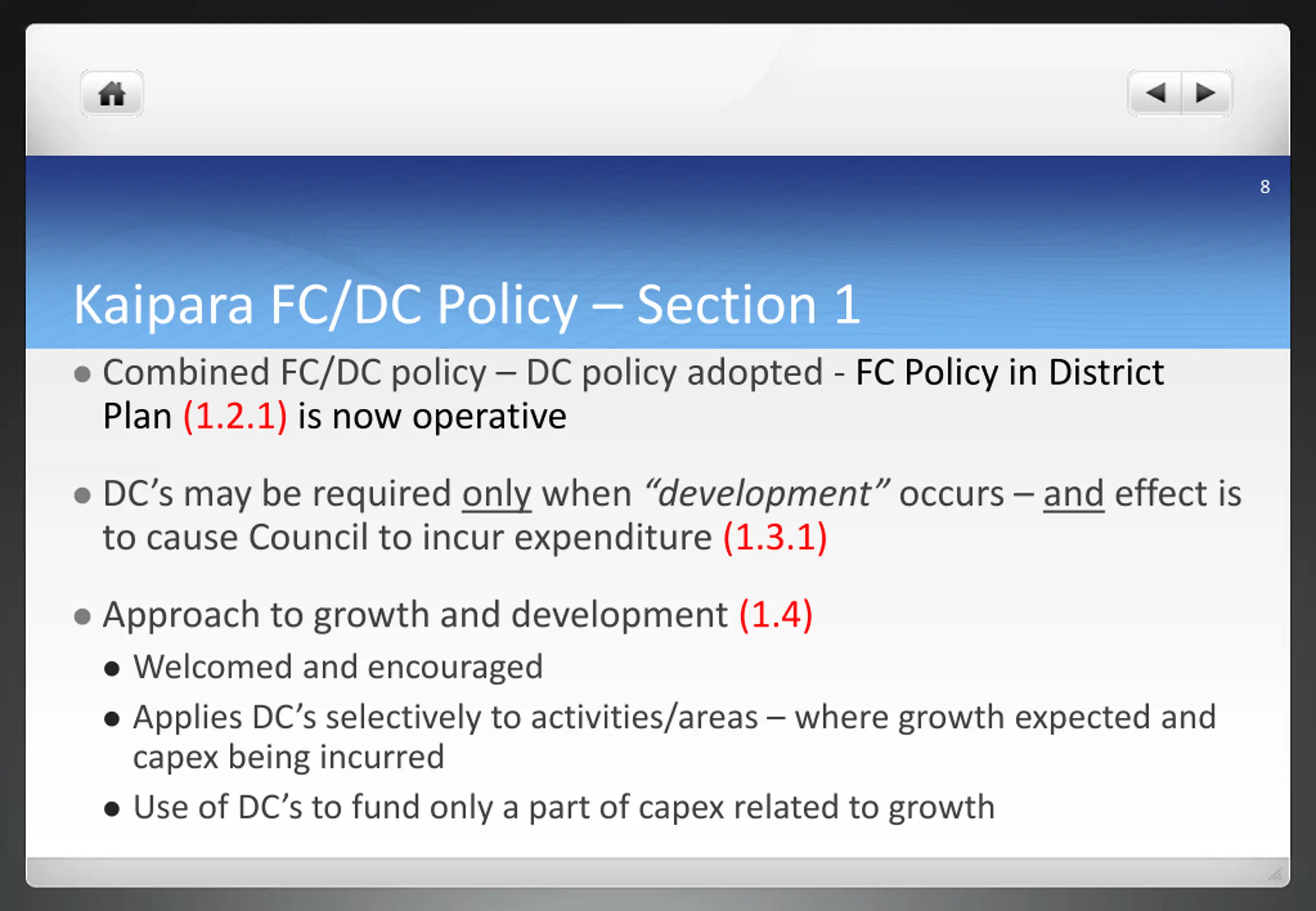 HomeButton.png 8 Kaipara FC/DC Policy Section 1 Combined FC/DC policy DC policy adopted - FC Policy in District Plan (1.2.1) is now operative DC s may be required only when development occurs and effect is to cause Council to incur expenditure (1.3.1) Approach to growth and development (1.4) Welcomed and encouraged Applies DC s selectively to activities/areas where growth expected and capex being incurred Use of DC s to fund only a part of capex related to growth