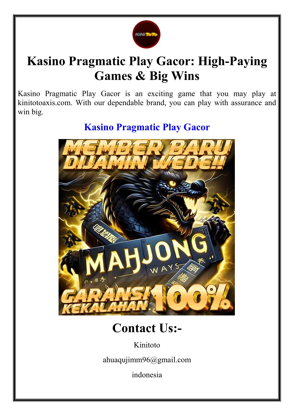 Kasino Pragmatic Play Gacor: High-Paying Games & Big Wins Kasino Pragmatic Play Gacor is an exciting game that you may play at kinitotoaxis.com. With our dependable brand, you can play with assurance and win big. Kasino Pragmatic Play Gacor Contact Us:- Kinitoto ahuaqujimm96@gmail.com indonesia