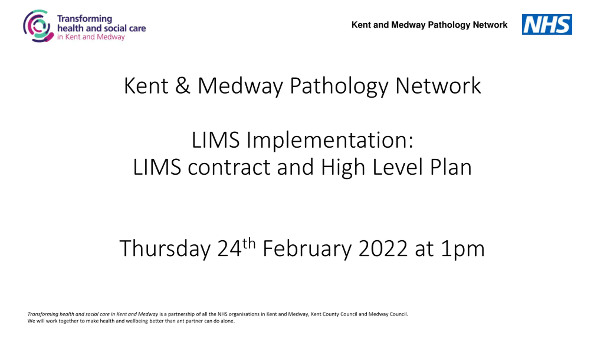 Kent and Medway Pathology Network Kent & Medway Pathology Network LIMS Implementation: LIMS contract and High Level Plan Thursday 24thFebruary 2022 at 1pm Transforming health and social care in Kent and Medway is a partnership of all the NHS organisations in Kent and Medway, Kent County Council and Medway Council. We will work together to make health and wellbeing better than ant partner can do alone.