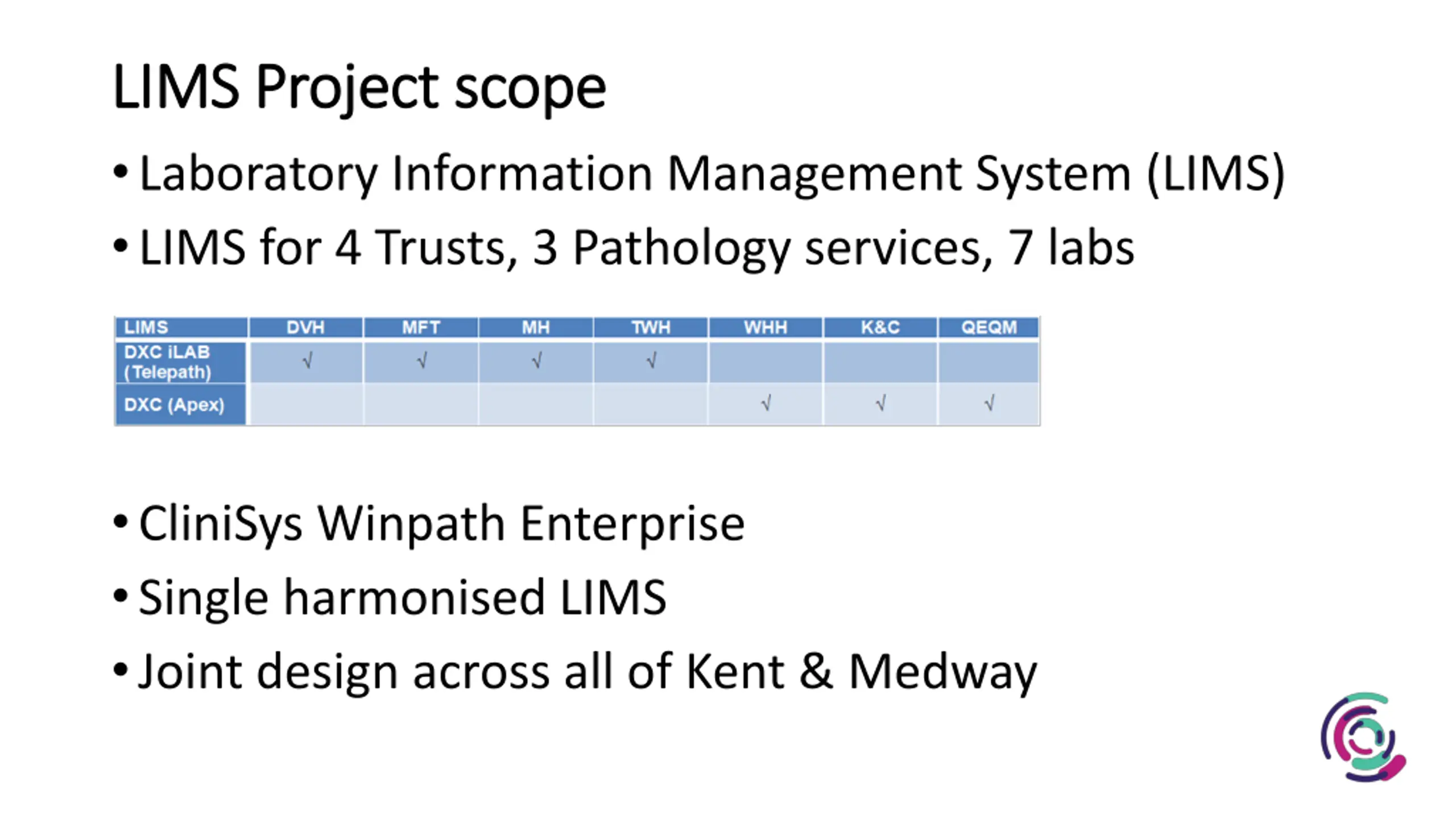 LIMS Project scope LIMS Project scope Laboratory Information Management System (LIMS) LIMS for 4 Trusts, 3 Pathology services, 7 labs CliniSys Winpath Enterprise Single harmonised LIMS Joint design across all of Kent & Medway