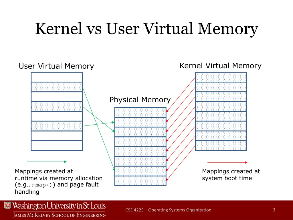 Kernel vs User Virtual Memory Kernel Virtual Memory User Virtual Memory Physical Memory Mappings created at runtime via memory allocation (e.g., mmap()) and page fault handling Mappings created at system boot time CSE 422S Operating Systems Organization 3