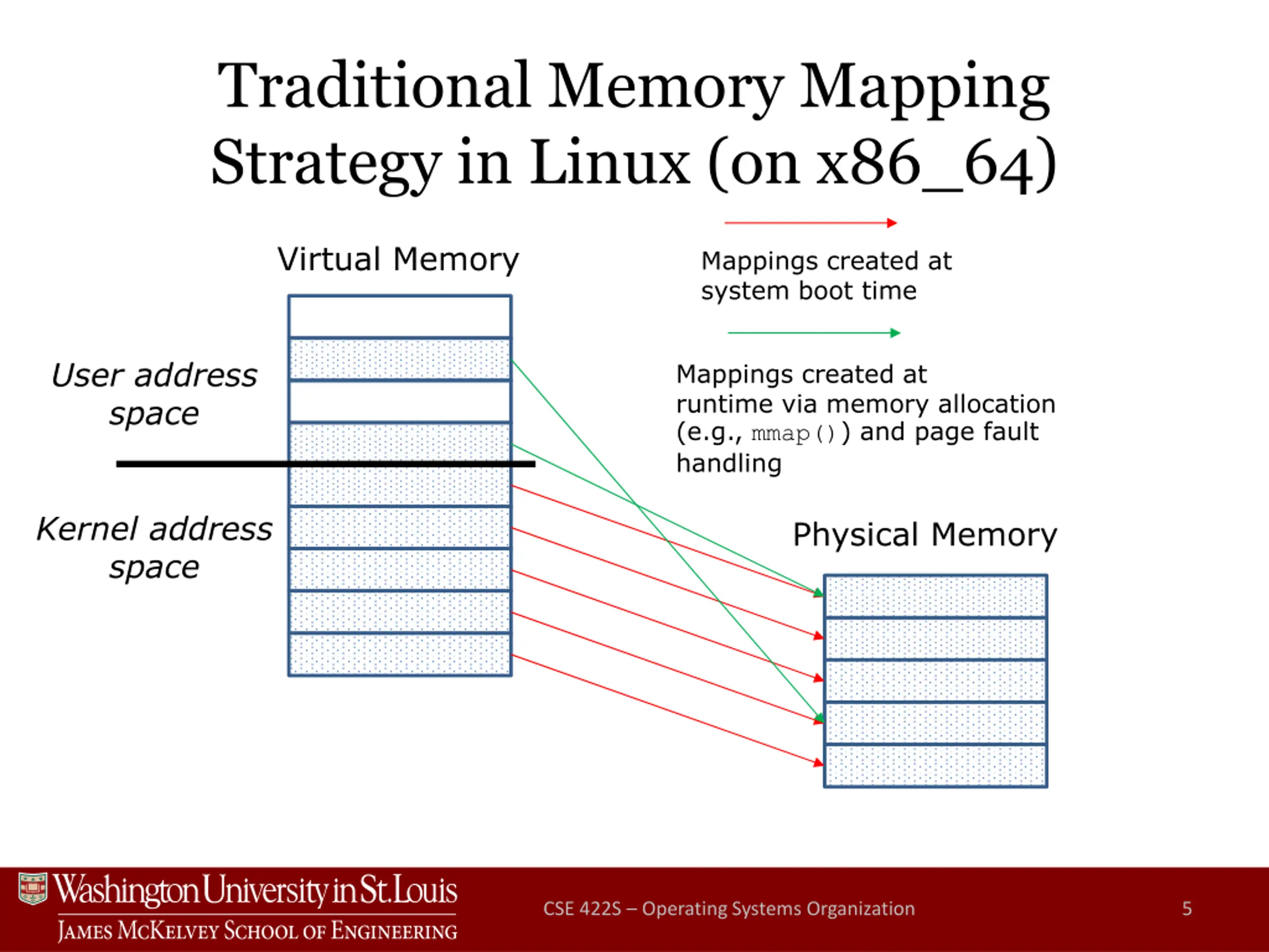 Traditional Memory Mapping Strategy in Linux (on x86_64) Virtual Memory Mappings created at system boot time Kernel address space Physical Memory CSE 422S Operating Systems Organization 4