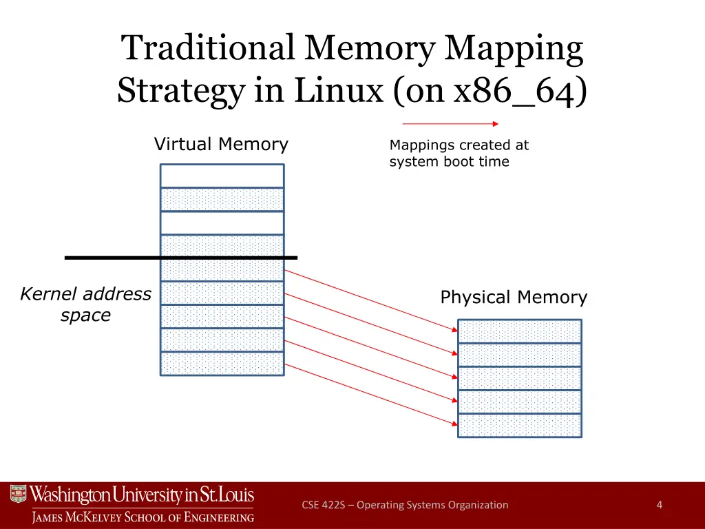 Traditional Memory Mapping Strategy in Linux (on x86_64) Virtual Memory Mappings created at system boot time User address space Mappings created at runtime via memory allocation (e.g., mmap()) and page fault handling Kernel address space Physical Memory CSE 422S Operating Systems Organization 5