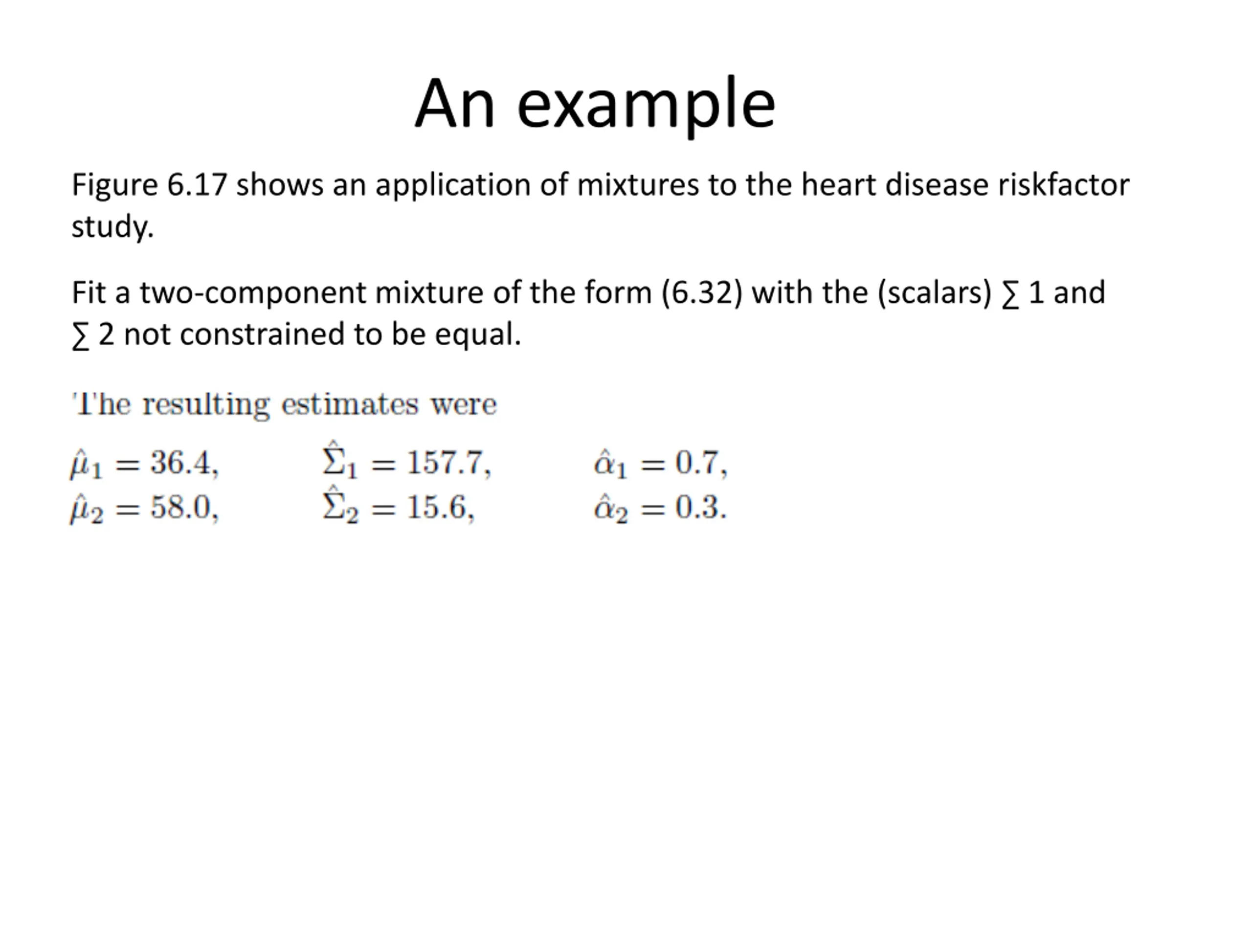 An example Figure 6.17 shows an application of mixtures to the heart disease riskfactor study. Fit a two-component mixture of the form (6.32) with the (scalars) 1 and 2 not constrained to be equal.