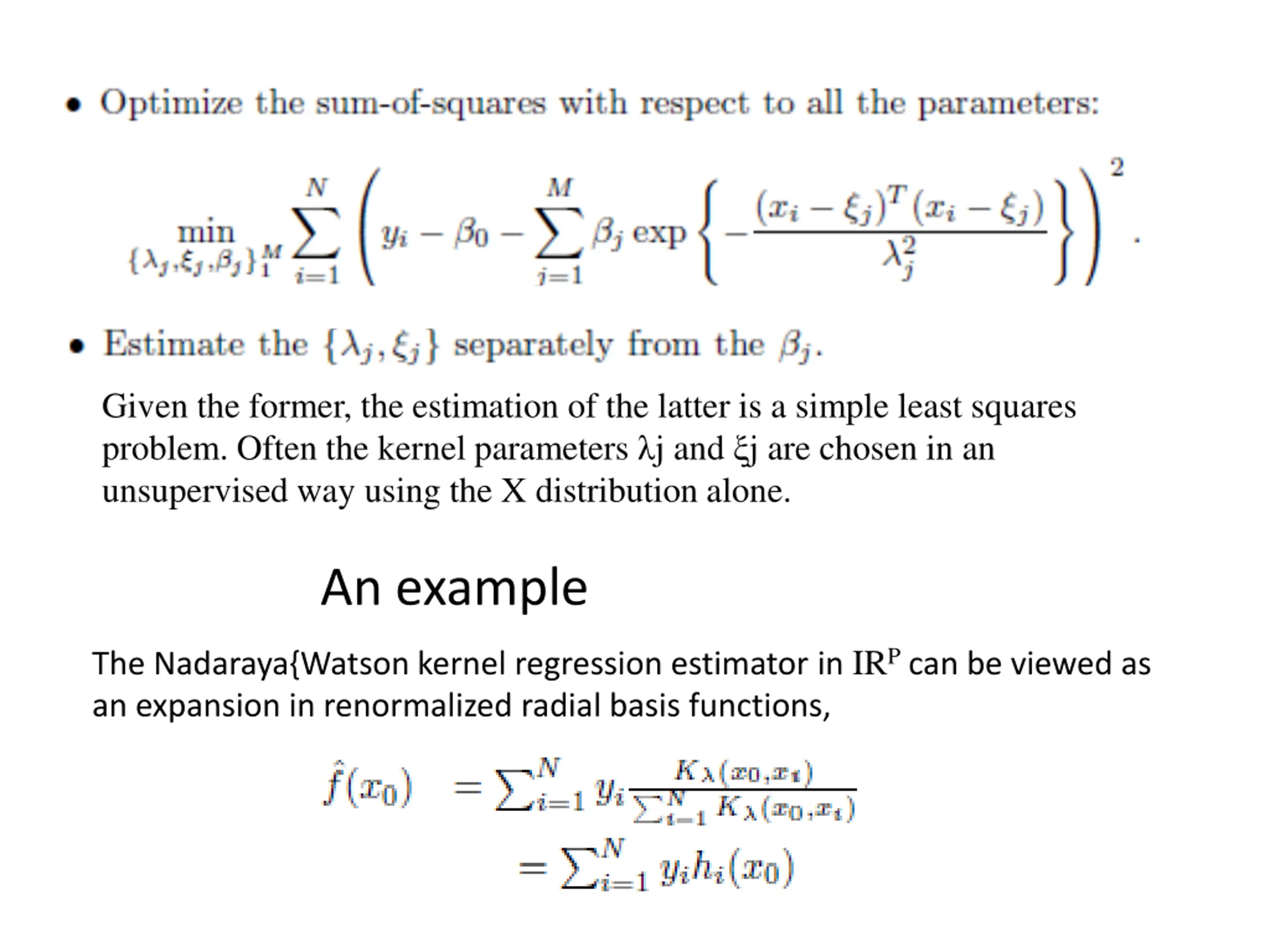 Given the former, the estimation of the latter is a simple least squares problem. Often the kernel parameters j and j are chosen in an unsupervised way using the X distribution alone. An example The Nadaraya{Watson kernel regression estimator in IRPcan be viewed as an expansion in renormalized radial basis functions,