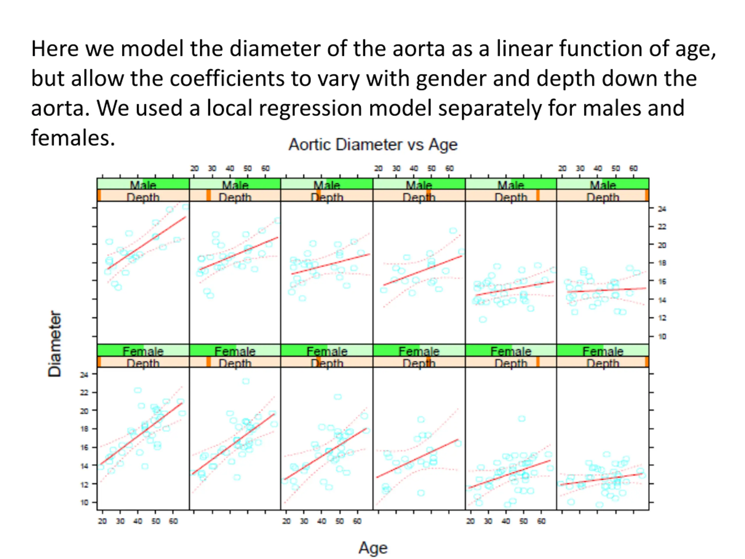 Here we model the diameter of the aorta as a linear function of age, but allow the coefficients to vary with gender and depth down the aorta. We used a local regression model separately for males and females.