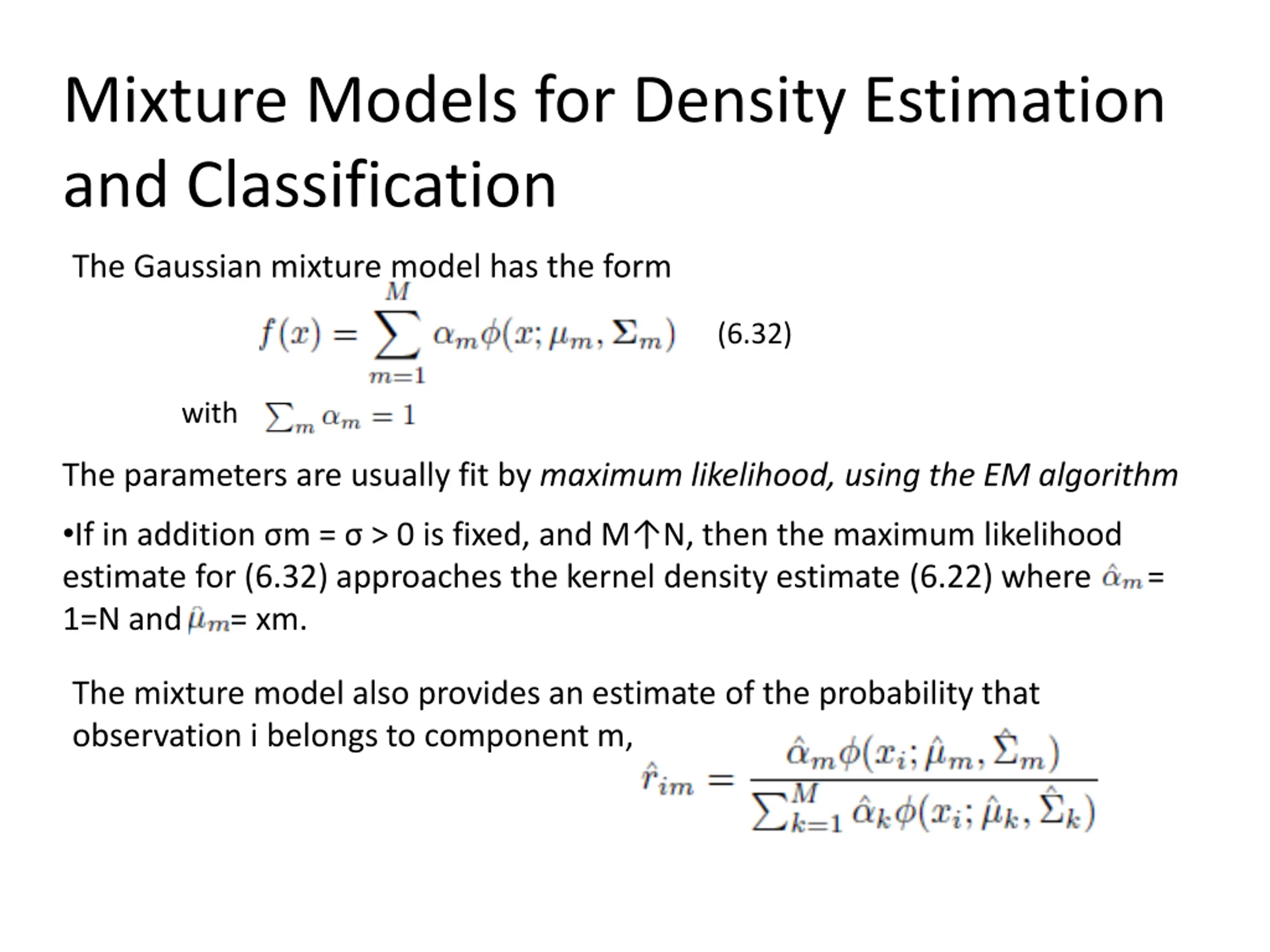 Mixture Models for Density Estimation and Classification The Gaussian mixture model has the form (6.32) with The parameters are usually fit by maximum likelihood, using the EM algorithm If in addition m = > 0 is fixed, and M N, then the maximum likelihood estimate for (6.32) approaches the kernel density estimate (6.22) where = 1=N and = xm. The mixture model also provides an estimate of the probability that observation i belongs to component m,