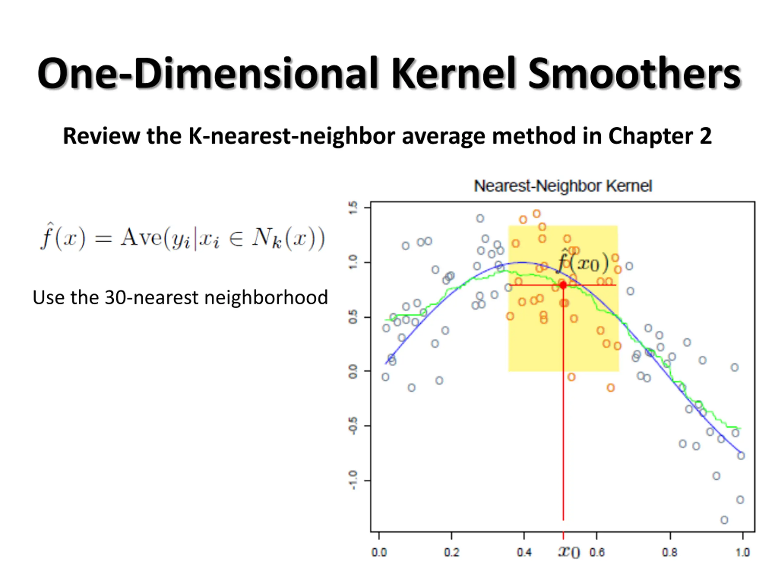 One-Dimensional Kernel Smoothers Review the K-nearest-neighbor average method in Chapter 2 Use the 30-nearest neighborhood