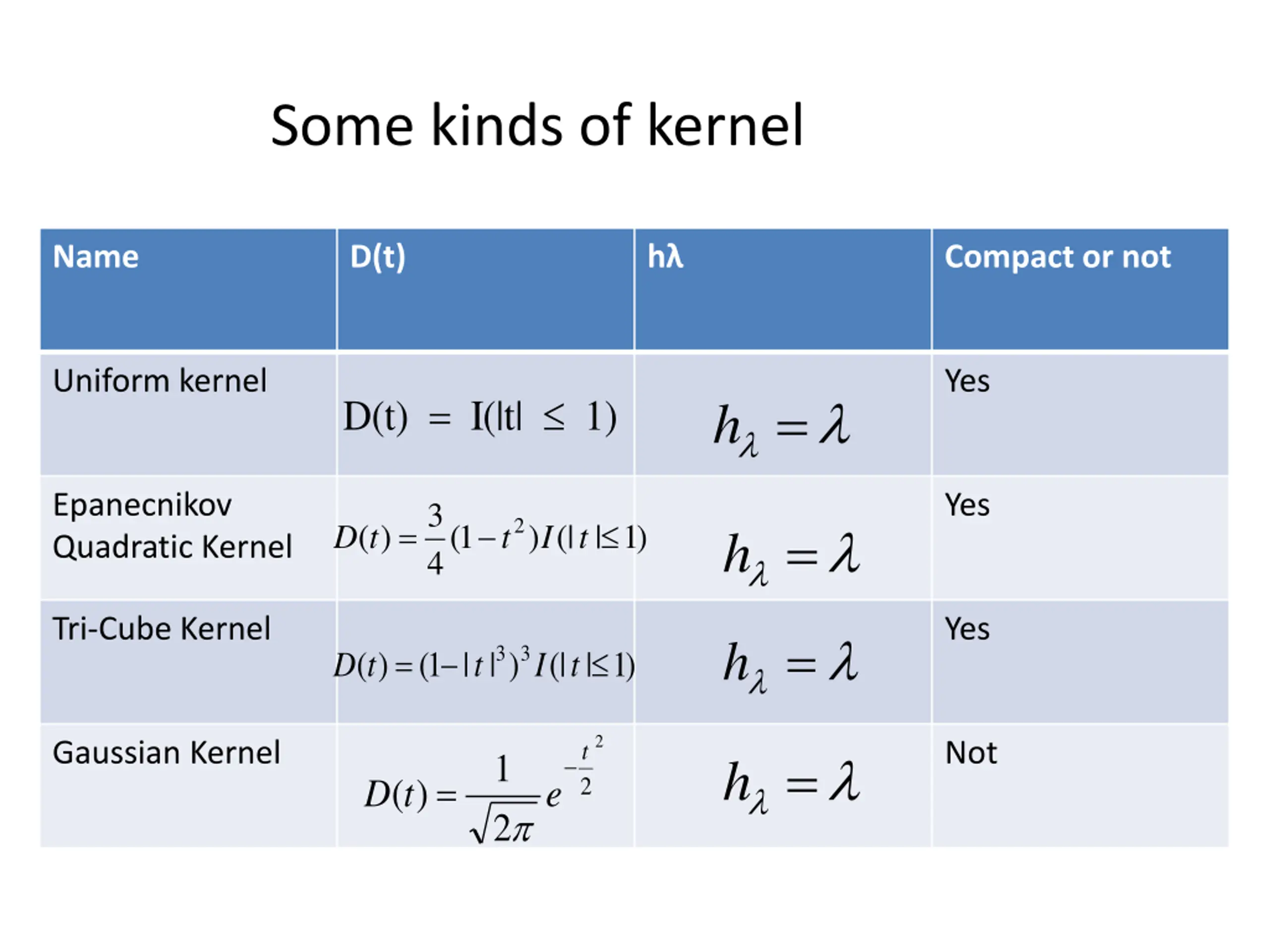 Some kinds of kernel Name D(t) h Compact or not Uniform kernel Yes = h = D(t) I(|t| 1) Epanecnikov Quadratic Kernel Yes 3 2 = ) 1 = h ( ) 1 ( ) (| | D t t I t 4 Tri-Cube Kernel Yes = h 3 3 = ) 1 ( ) 1 ( | ) | (| | D t t I t 2 t Gaussian Kernel Not = h 1 = ( ) D t e 2 2