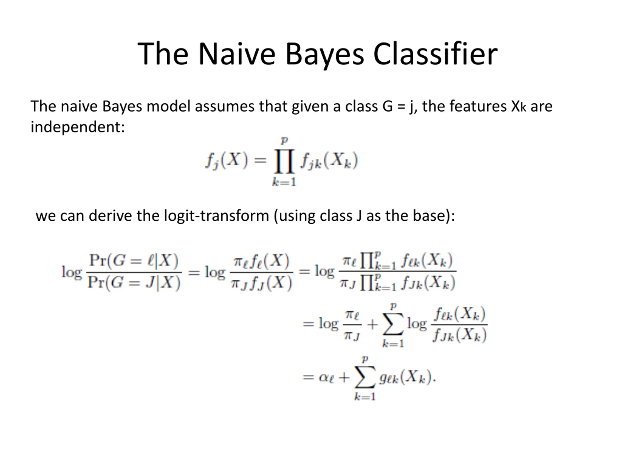 The Naive Bayes Classifier The naive Bayes model assumes that given a class G = j, the features Xk are independent: we can derive the logit-transform (using class J as the base):