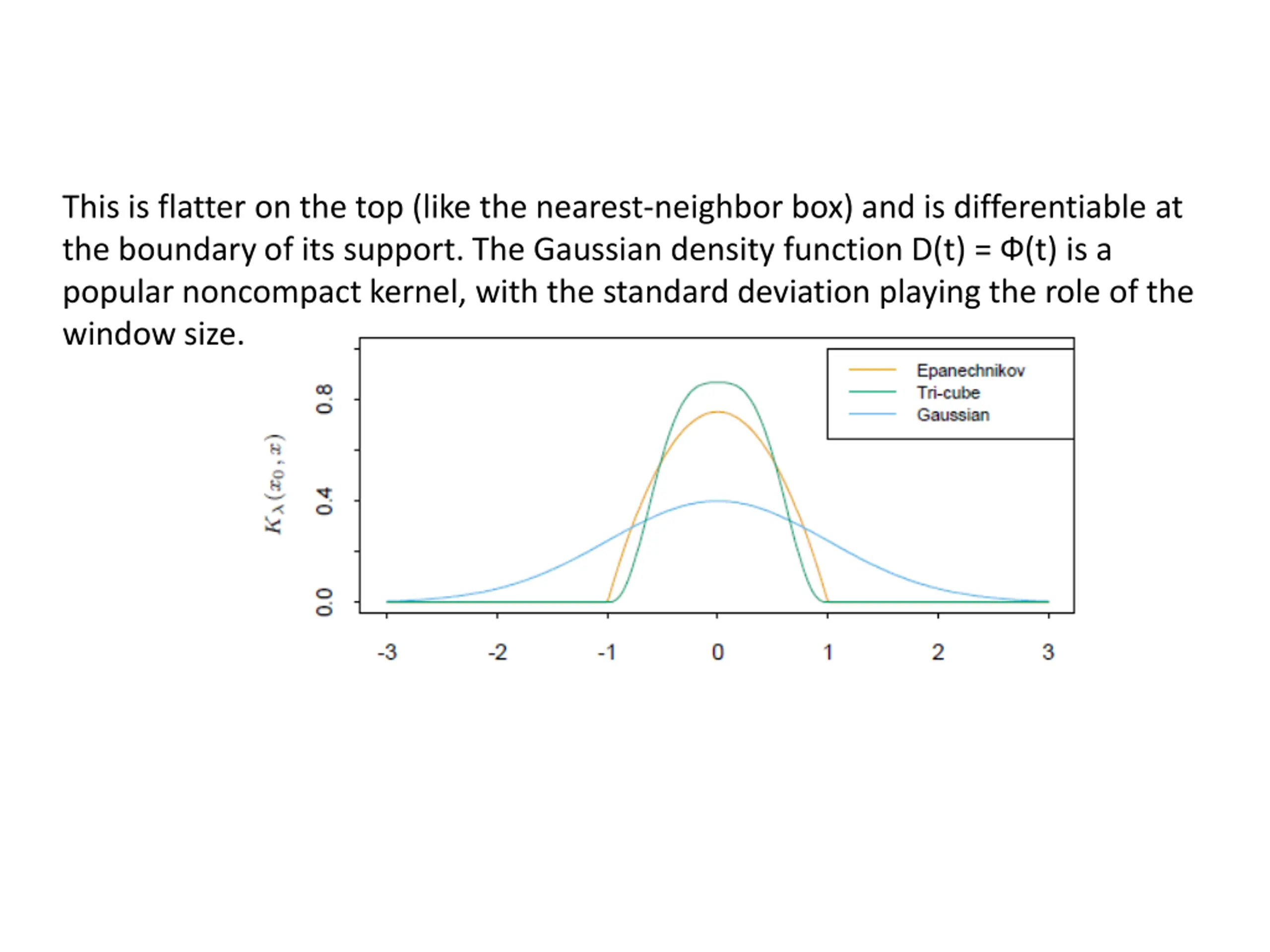 This is flatter on the top (like the nearest-neighbor box) and is differentiable at the boundary of its support. The Gaussian density function D(t) = (t) is a popular noncompact kernel, with the standard deviation playing the role of the window size.