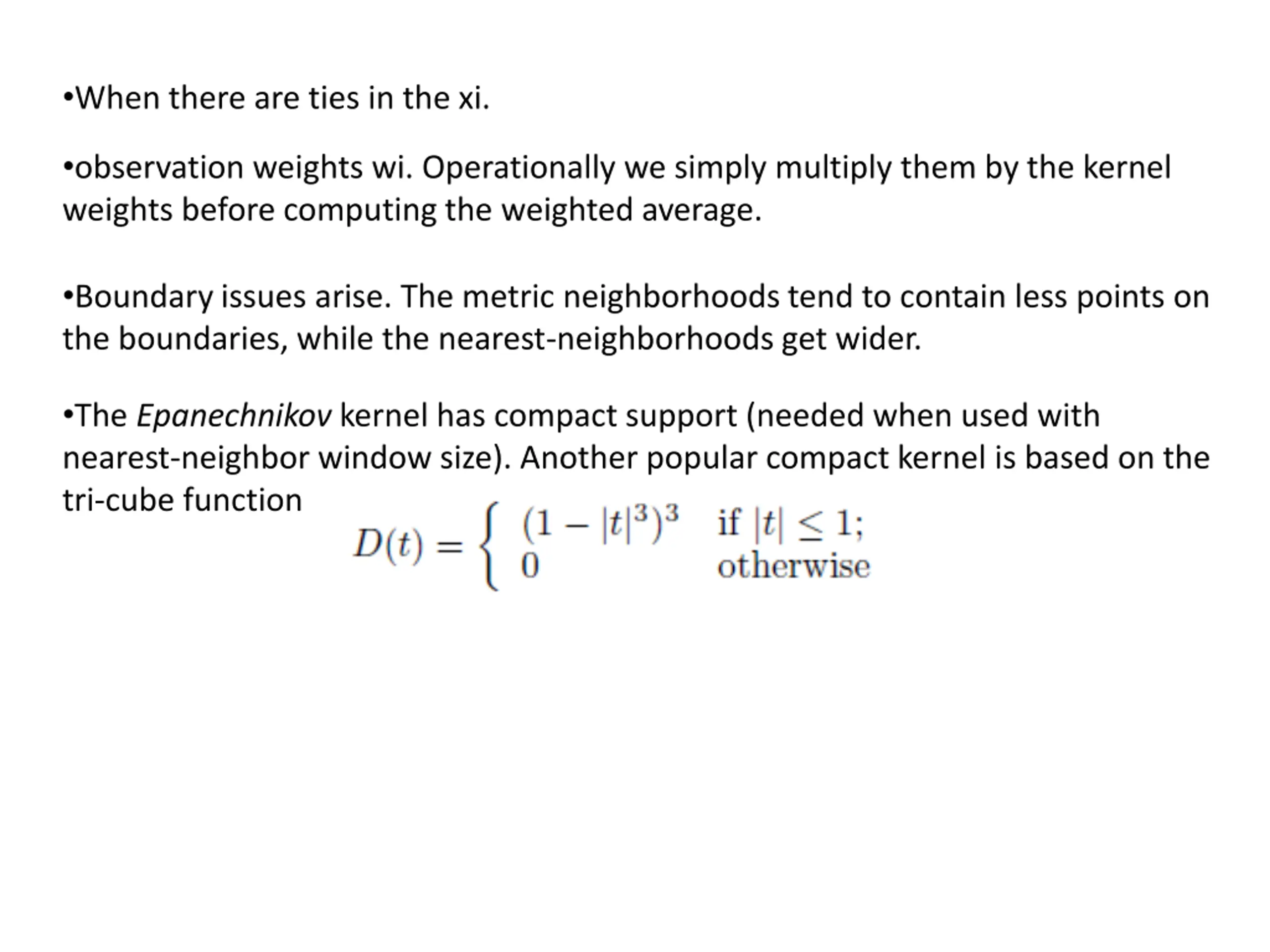 When there are ties in the xi. observation weights wi. Operationally we simply multiply them by the kernel weights before computing the weighted average. Boundary issues arise. The metric neighborhoods tend to contain less points on the boundaries, while the nearest-neighborhoods get wider. The Epanechnikov kernel has compact support (needed when used with nearest-neighbor window size). Another popular compact kernel is based on the tri-cube function