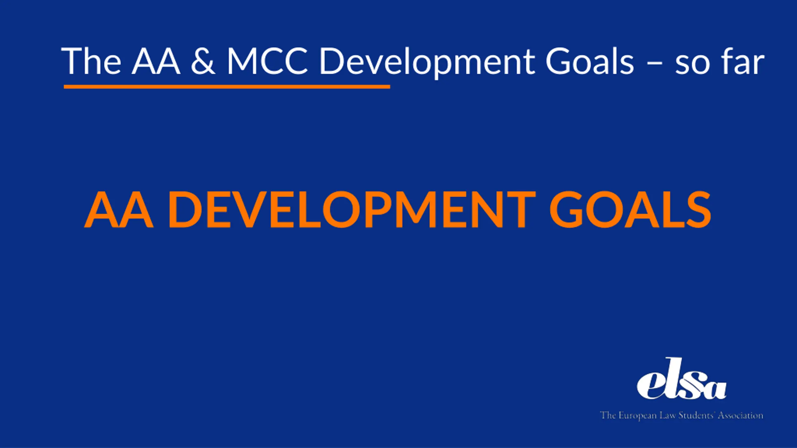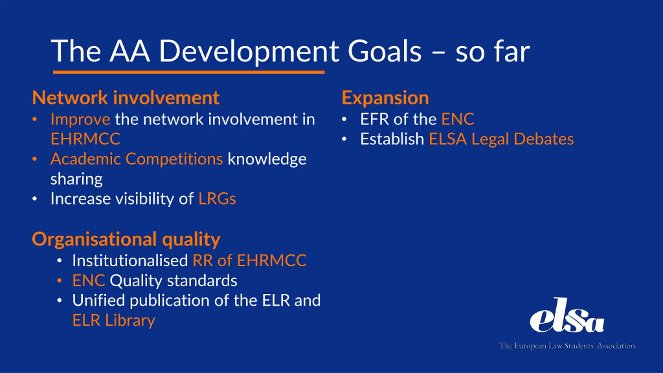 The AA Development Goals so far Network involvement Improve the network involvement in EHRMCC Academic Competitions knowledge sharing Increase visibility of LRGs Expansion EFR of the ENC Establish ELSA Legal Debates Organisational quality Institutionalised RR of EHRMCC ENC Quality standards Unified publication of the ELR and ELR Library