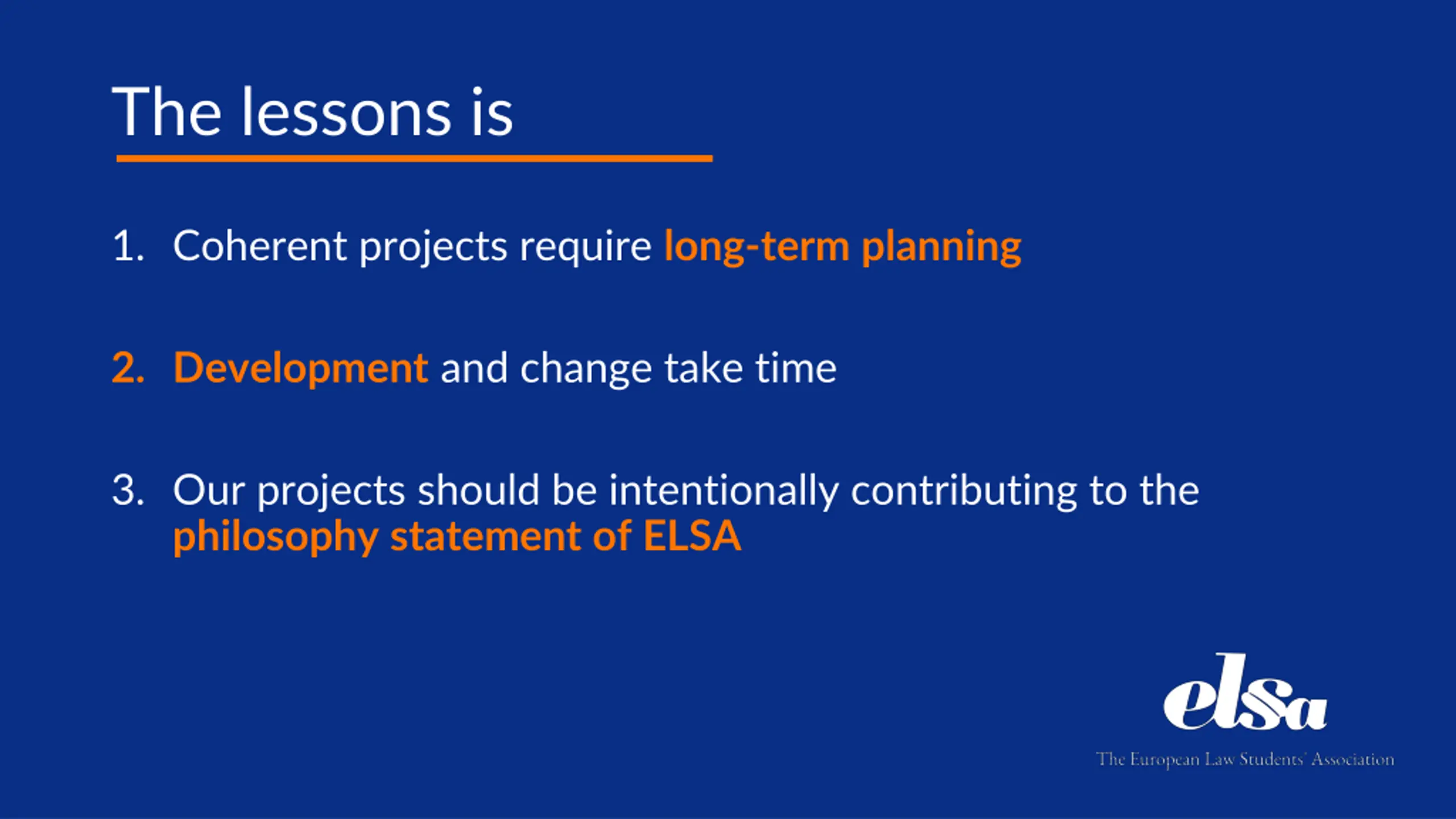 The lessons is 1. Coherent projects require long-term planning 2. Development and change take time 3. Our projects should be intentionally contributing to the philosophy statement of ELSA