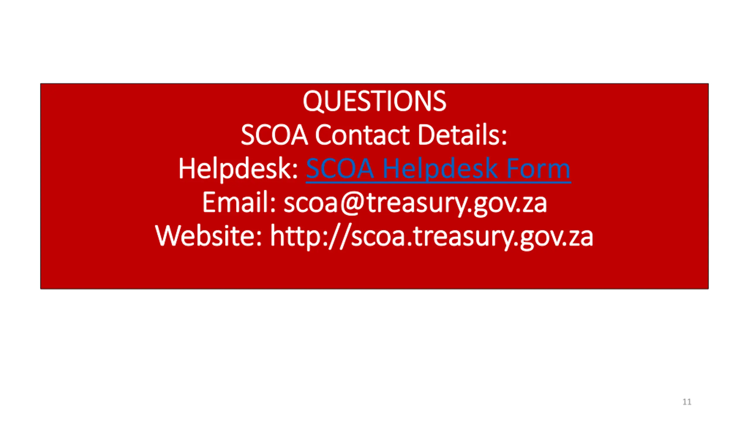 QUESTIONS QUESTIONS SCOA Contact Details: SCOA Contact Details: Helpdesk: Helpdesk: SCOA Helpdesk Form Email: scoa@treasury.gov.za Email: scoa@treasury.gov.za Website: http://scoa.treasury.gov.za Website: http://scoa.treasury.gov.za 11